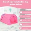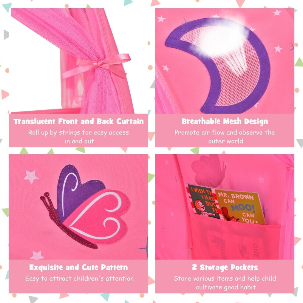 This play tent is an ideal gift for your kids. It can be used in bed or on the ground, providing your kids with a private space and they will love the cute dream bed tent very much. Peach skin fabric features soft and skin-friendly touch for comfort while durable and sturdy fiberglass rods greatly improve its stability. The mesh windows at the top are designed for ventilation and view of outer world. In addition, the tent is spacious for all kinds of activities, such as playing games, reading, sleeping and so on. The storage pockets are convenient for storing books and toys, which helps your kid develop a good habit. Don't hesitate to take it home!
