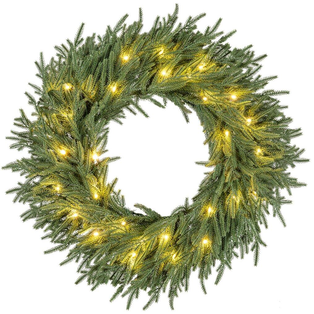 ● Realistic & Vivid Appearance: Featuring 108 densely clustered branch tips, the pre-lit Christmas wreath delivers a full, lifelike appearance that stands out in any setting. Complemented by 35 warm white LED lights, it bathes your space in a soft, inviting light.