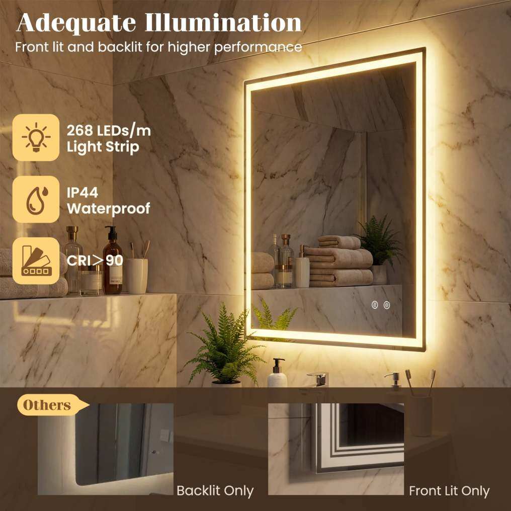 ● Powerful and Adequate Lighting: This LED bathroom mirror features frontlit and backlit illumination with a high-performance 268 LEDs/m light strip. With an IP44 waterproof rating and a color rendering index above 90, it provides bright, even and natural-looking light that enhances your daily routine.