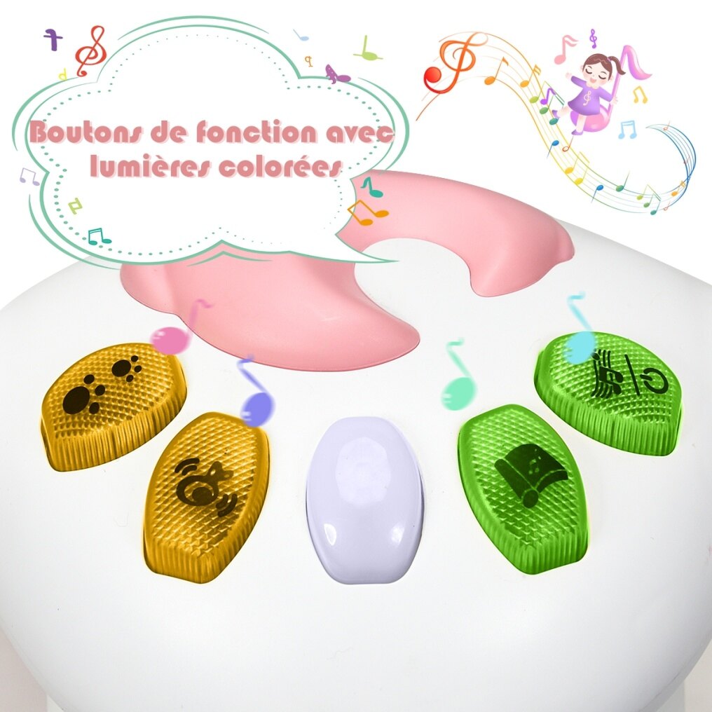 • Function buttons with music and animal sounds to attract baby’s interest