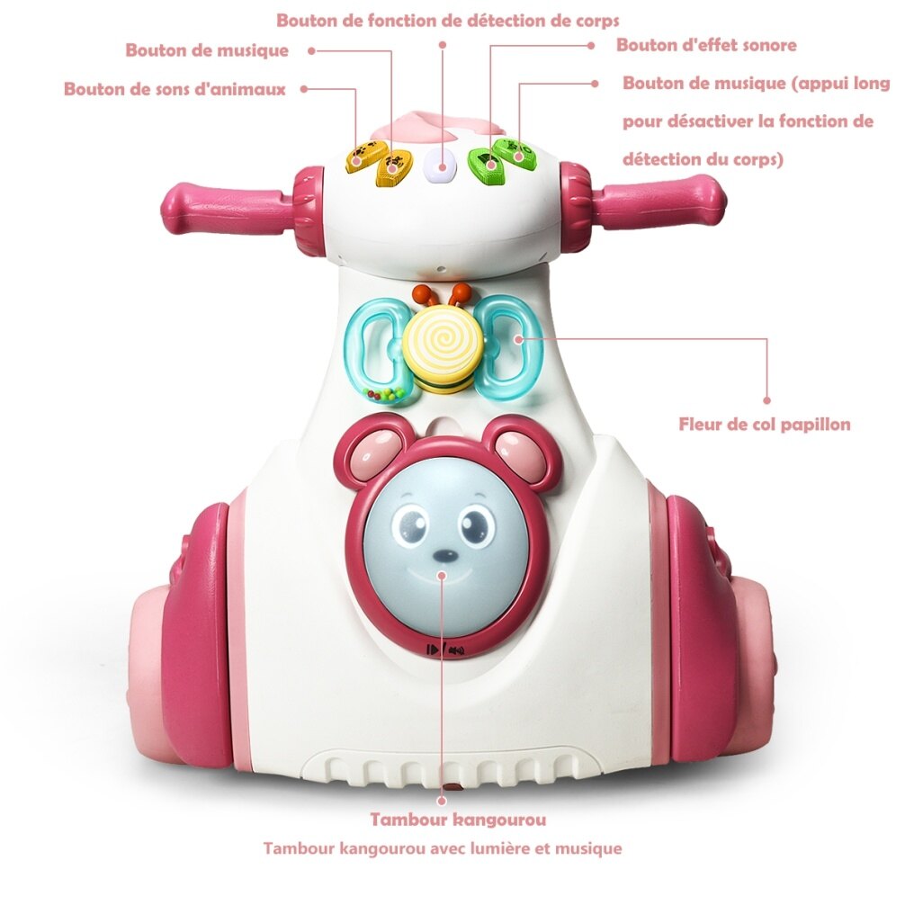 • Interesting Kangaroo Drum: The butterfly collar flower and kangaroo drum are installed in front of the ride on, and both can be taken out to play alone. After turning on the switch, you can hit the drum to play music and touch it again to play next one. Long press to activate mute mode and long press it again to recover music mode!
