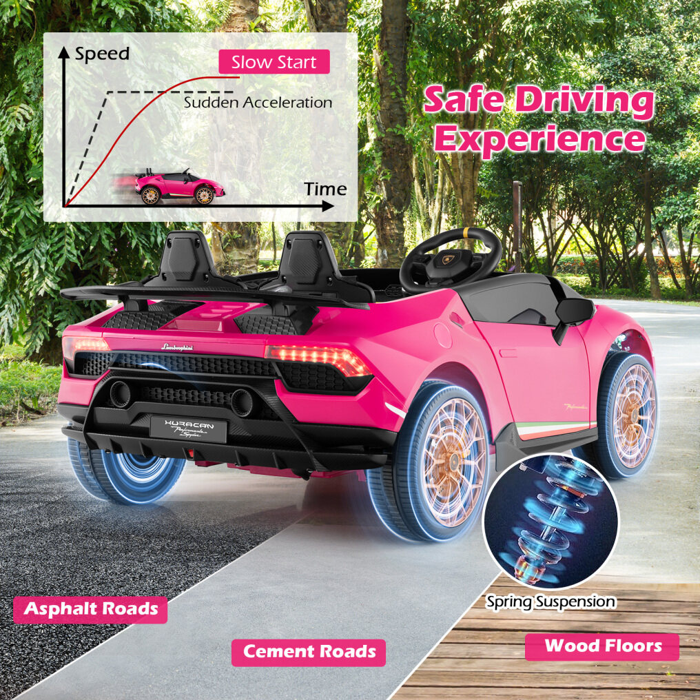 ● Thrilling and Safe Ride: Powered by a 24V battery and 4 45W motors, this Lamborghini toy car can drive at 1.2-4 mph speed on various terrains. The slow start function avoids the risk of sudden acceleration. Plus, the 3-point independent safety belts and rear wheels with spring suspension ensure added safety.