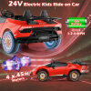 ● Thrilling and Safe Ride: Powered by a 24V battery and 4 45W motors, this Lamborghini toy car can drive at 1.2-4 mph speed on various terrains. The slow start function avoids the risk of sudden acceleration. Plus, the 3-point independent safety belts and rear wheels with spring suspension ensure added safety.
