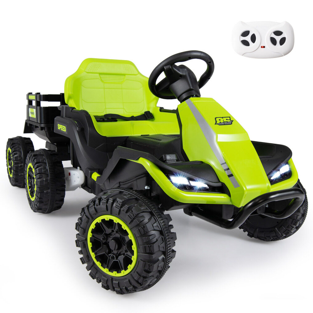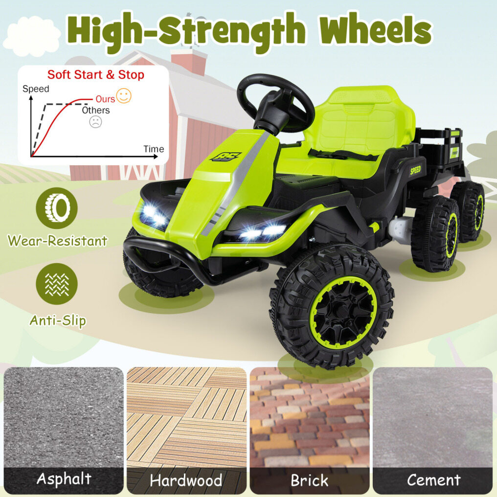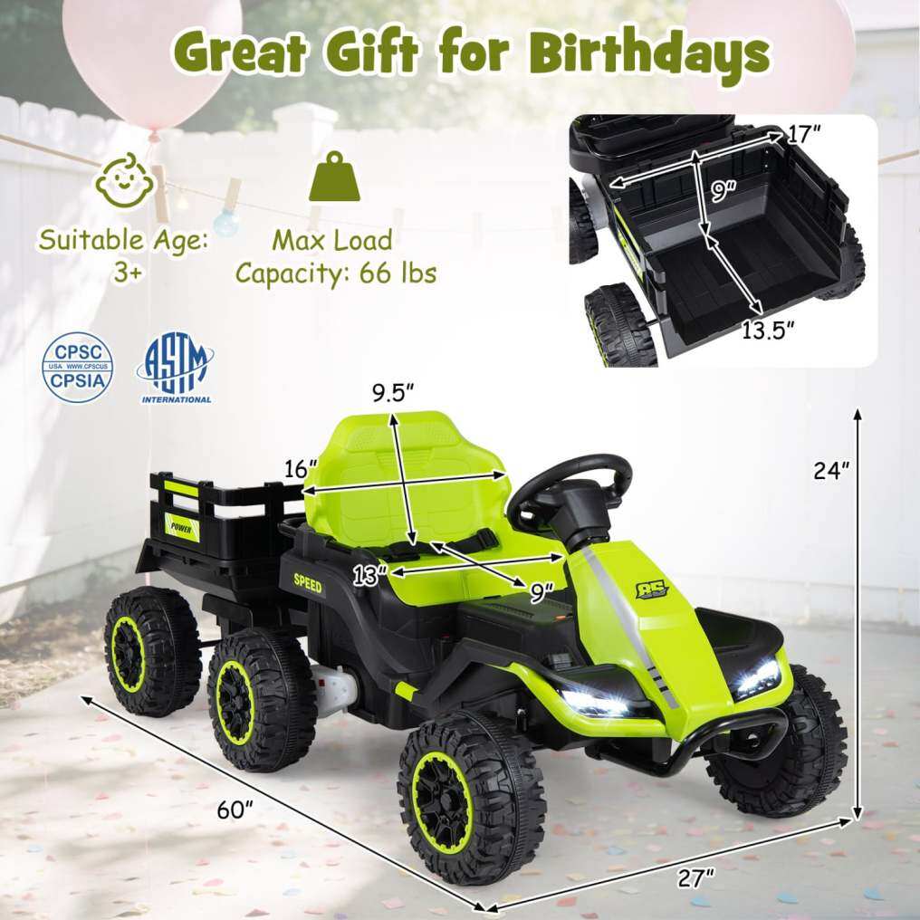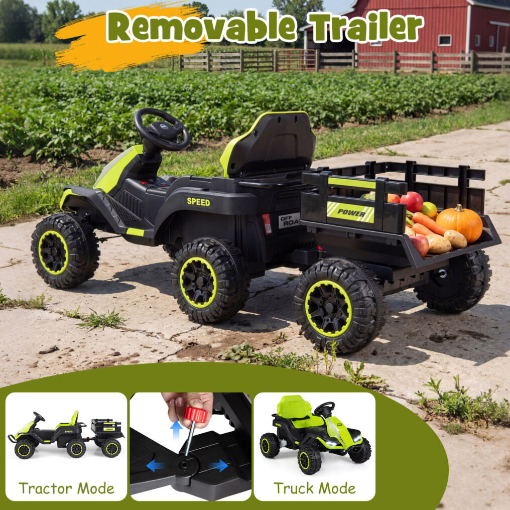 ● Detachable Trailer Design: Switch play styles in seconds with the ASTM and CPSIA compliant 2-in-1 ride on tractor that transforms from tractor mode to truck mode by attaching or removing the trailer. Kids can haul toys, snacks, or garden "cargo," then cruise freely when they want a sleeker ride.