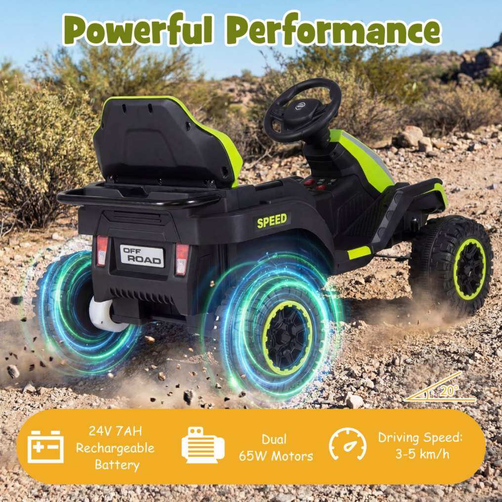 ● Powerful 24V Performance: Let kids ride longer and stronger with a 24V 7AH battery and dual 65W motors built for steady movement. Soft start and stop helps reduce sudden jolts for a smoother feel. The kids ride on tractor features wear-resistant, anti-slip wheels that keep traction on cement, asphalt, brick, wood, and more.