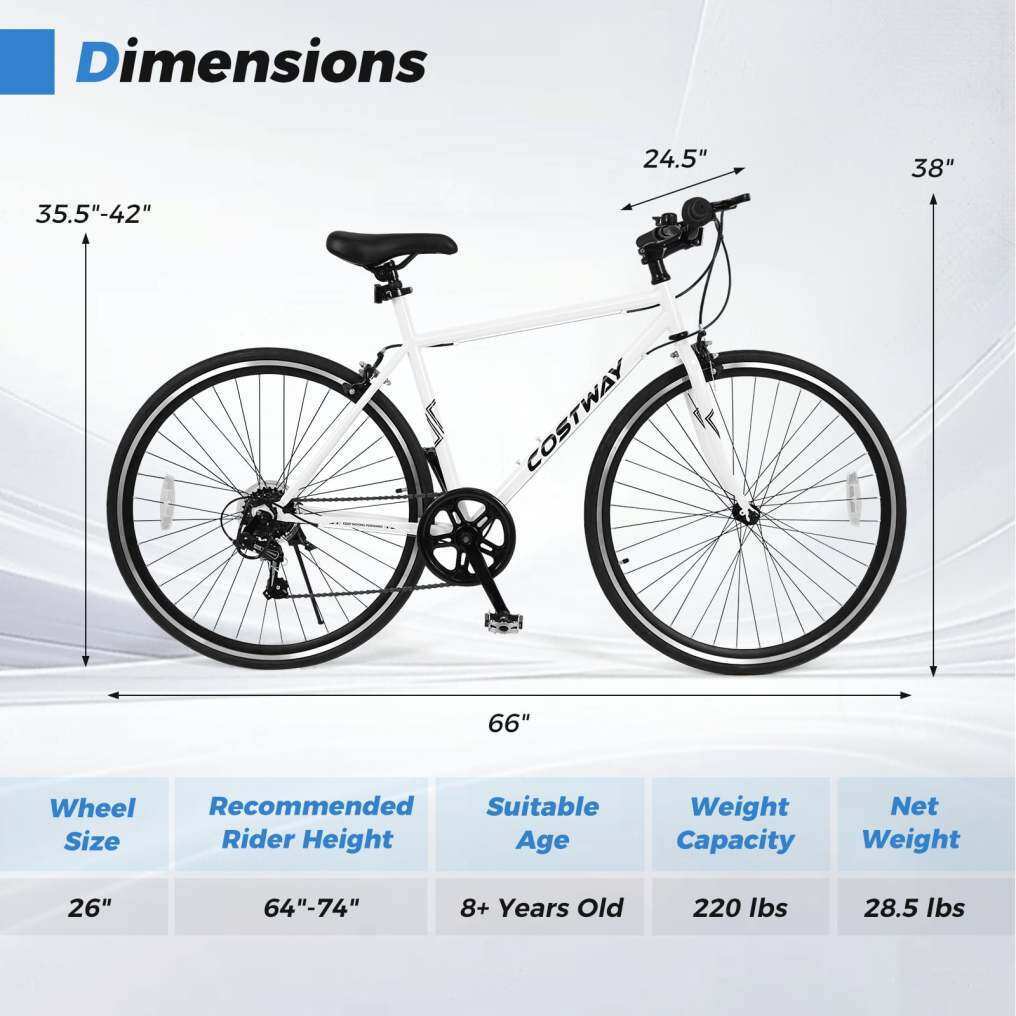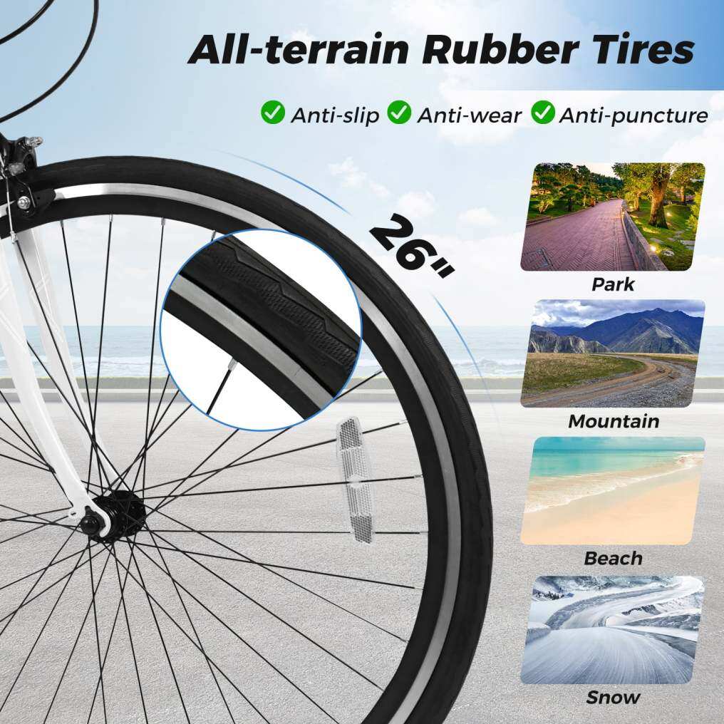 ● All-terrain Rubber Tires: Equipped with 26" rubber tires that are anti-slip, anti-wear and anti-puncture, this outdoor cycling bike ensures smooth rides on diverse surfaces, including the park, mountain beach, snow and more.