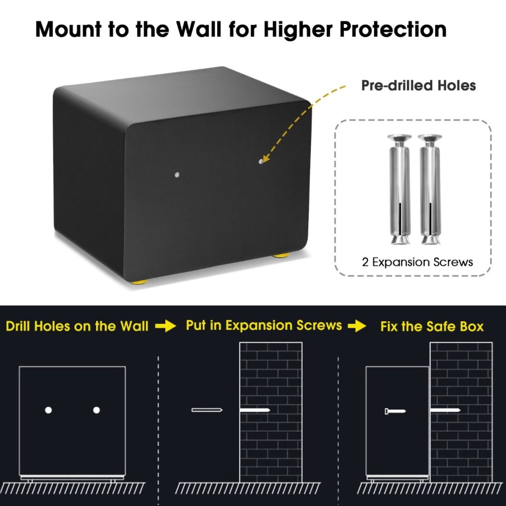 Easy to Install & Wide Application: This electronic safety box comes with 2 pre-drilled holes and 2 expansion bolts for mounting to the wall or cabinet, which adds extra security for your valuables. With the space-saving and practical design, the safe is perfect for the home, office, hotel or business safe use.