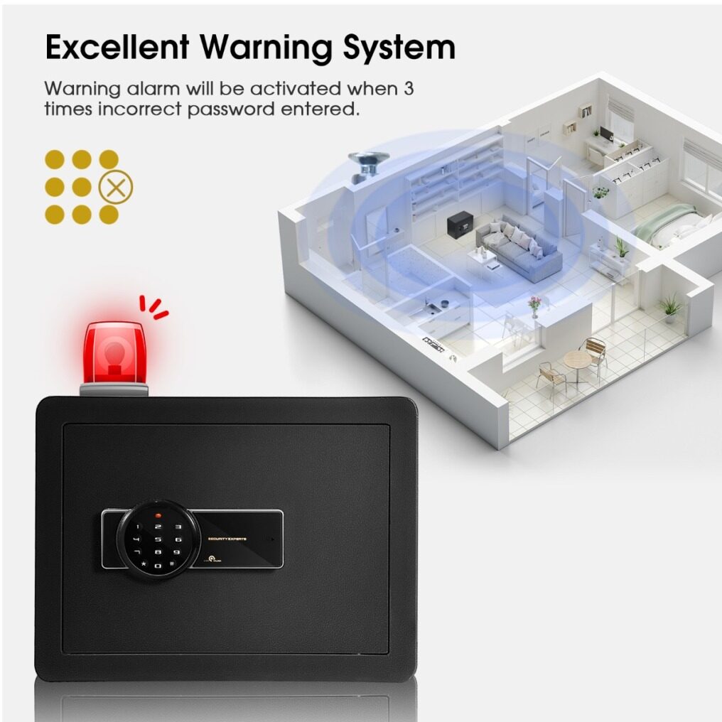 Reliable Warning System & Anti-peeping Code: The alarm sound will go off and the red indicator will flash if 3 times of failed password attempts. Only after correct code entered can the warning system stop. Better yet, the safe box features mask code technology that effectively avoids peeping.