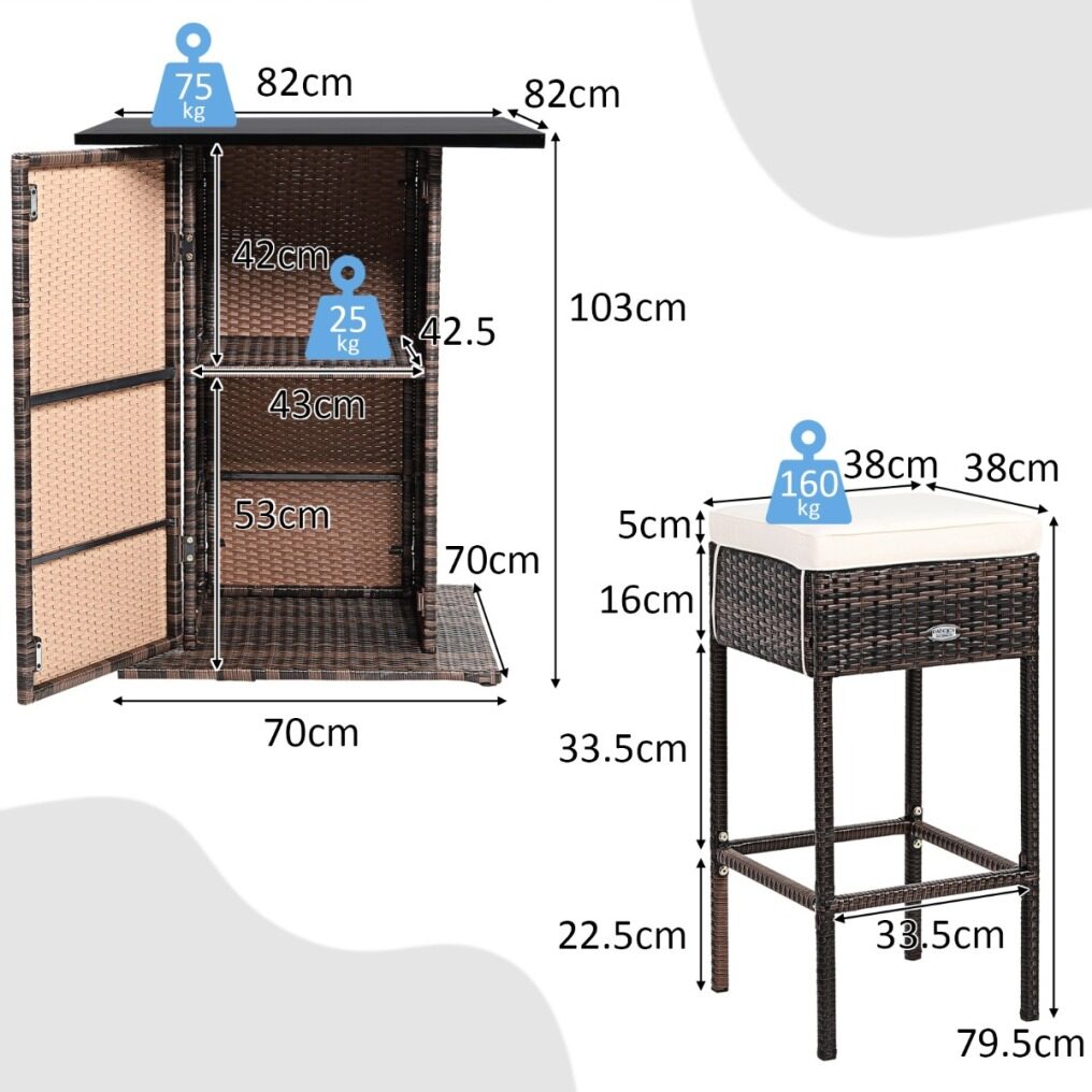 Product Information: Dimension of table: 32'' x 32'' x 40.5'' (L x W x H), dimension of each stool: 15'' x 15'' x 31'' (L x W x H), dimension of seat cushion: 15'' x 15'' x 2'' (L x W x Thickness), weight capacity of tabletop: 165 lbs, weight capacity of middle shelf: 55 lbs, weight capacity of each stool: 350 lbs. Please note that the product will be shipped in two separate packages which may be delivered separately from each other. If you have any questions, please feel free to contact us.