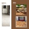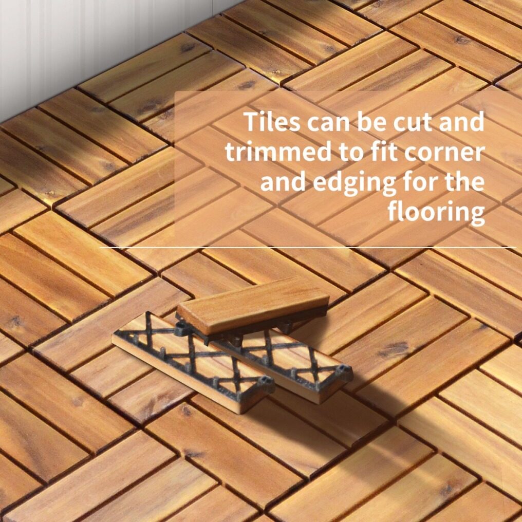 Those tiles are enough to cover 27 Sq. Ft of flooring on your terrace, patio deck, or indoor living spaces. You can pave some tracks or mats out of them. Interlocking mechanisms help you renovate without any hand of tools. You can make some cuts and trim on the tile to fit the figure of your floors. And thanks to the plastic mats, those tiles won't mess up your old floor. And featuring actual pre-oiled acacia wood logs, it has the real effect of a hardwood floor with a lower cost. Besides, it will last longer on the outside, if you oil those tiles once per 2-3 months.