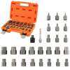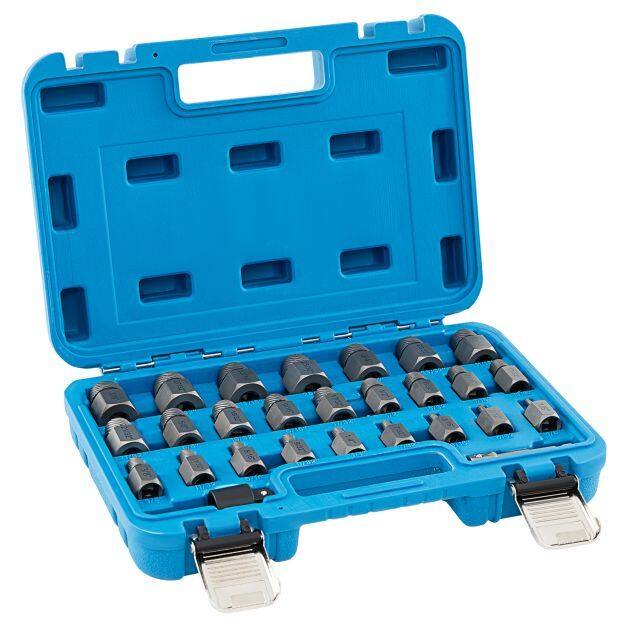 The screw extractor set includes 2 adapters and 25 extractors from 1/8" to 7/8" in 1/32" increments, all in a HDPE case. Designed for effortless removal of worn, frozen and damaged screws, this versatile set is particularly useful in applications such as auto repairs, home renovations and machine installations. The innovative 3/8" square drive design offers flexible connection options and simplifies use with a ratchet wrench. The multi-spline design coupled with an inverted spiral maximizes grip while minimizing user effort. Made from heat-treated Cr-Mo steel, this set is built to withstand heavy-duty use and harsh conditions.
