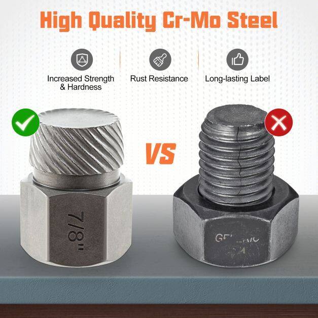 Premium Quality: Each screw extractor is made of chrome molybdenum steel, known for its hardness and strength. The heat treatment process has increased its rust resistance for use in harsh conditions and the laser engraved markings remain readable over time.