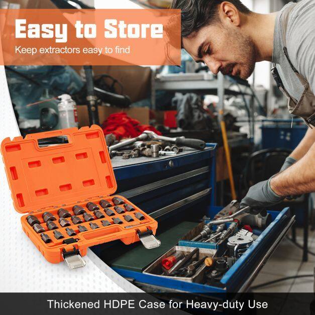 Compatibility with Multiple Tool Types: The 27-piece screw extractor set includes a 1/2-inch to 3/8-inch adapter and a 1/4-inch to 3/8-inch adapter with a 65mm extension, ensuring compatibility with a wide range of power, pneumatic and hand tools. The set enables efficient extraction of worn, frozen, rusted or damaged screws and bolts.