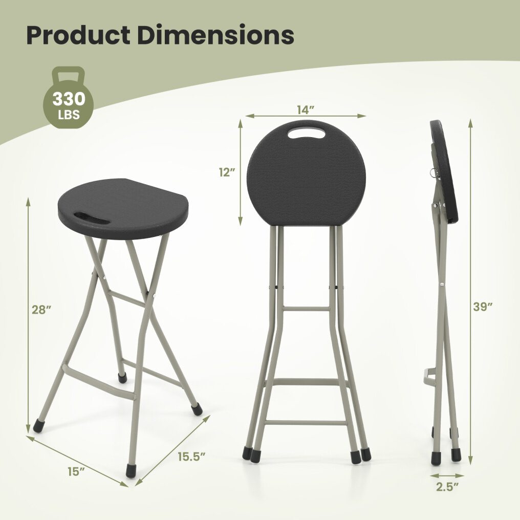 ● No Assembly Required and Compact Size: There is no need to worry about hassle installation or complex instruction. This collapsible round stool can be easily expanded and folded up in just seconds. The expanded dimension is 14" x 12" x 28" (L x W x H), and the folded dimension is 14" x 2" x 39" (L x W x H).