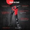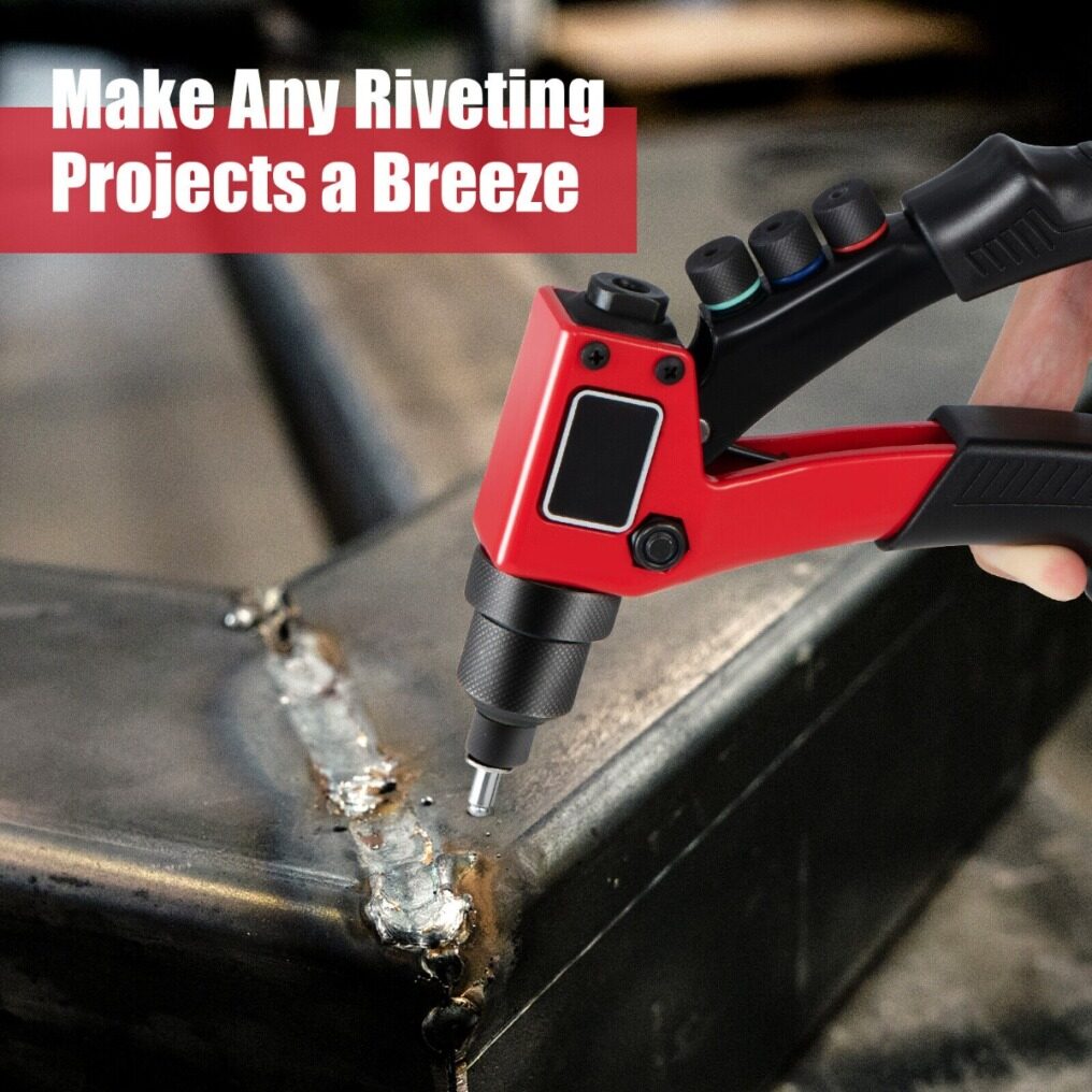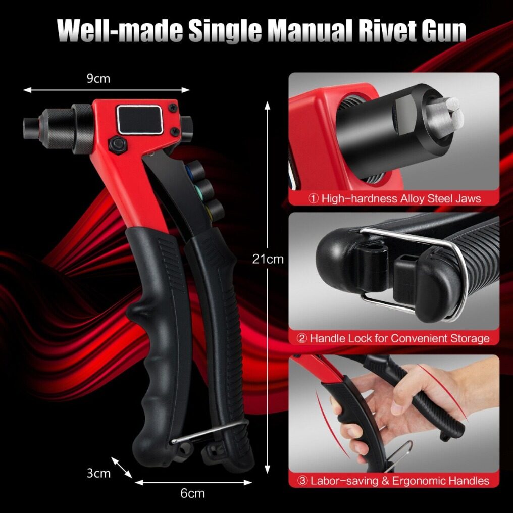 - Durable and Solid Material: Made of high-hardness alloy steel jaws, solid aluminum alloy body and high-strength carbon steel handle, this manual rivet gun ensures great rust resistance and durability. Moreover, the handles with reinforced heat treatment make the rivet gun strong enough to support long-lasting use.