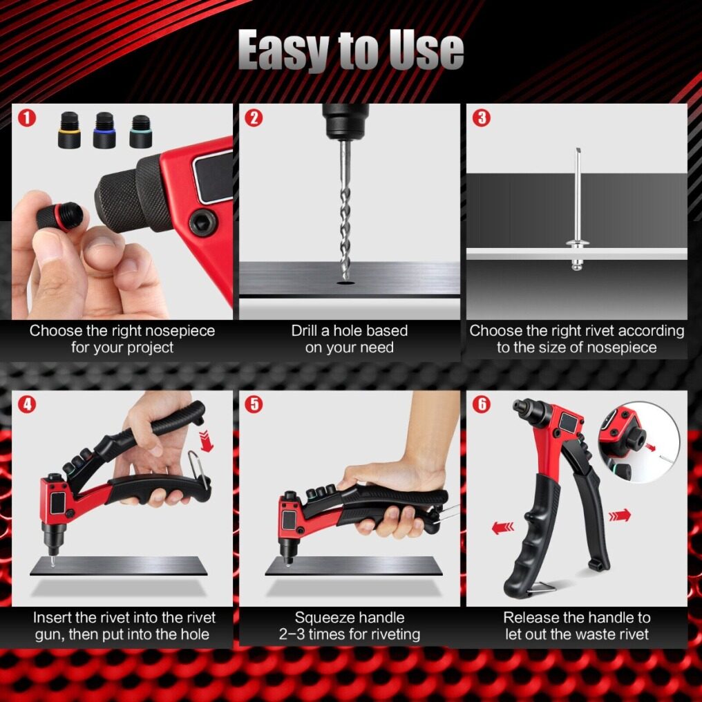 - Portable Design and Wide Application: The rugged blow molded case with designated slots inside not only helps store and organize everything in one place, but also makes it easy to carry. Moreover, the rivet gun can handle 3 types of rivets: aluminum, steel, and stainless steel to meet various riveting needs, such as metal work, automotive, elevator, instrument, furniture, etc.