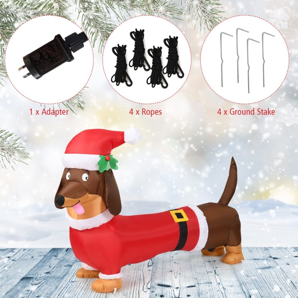 Durable Material & Stable Base: Made of waterproof 190T polyester cloth, our Christmas inflatable dog is durable and leak-proof enough for outdoor usage. Besides, it is equipped with a built-in sandbag, 4 ropes and 4 ground stakes to increase its stability.