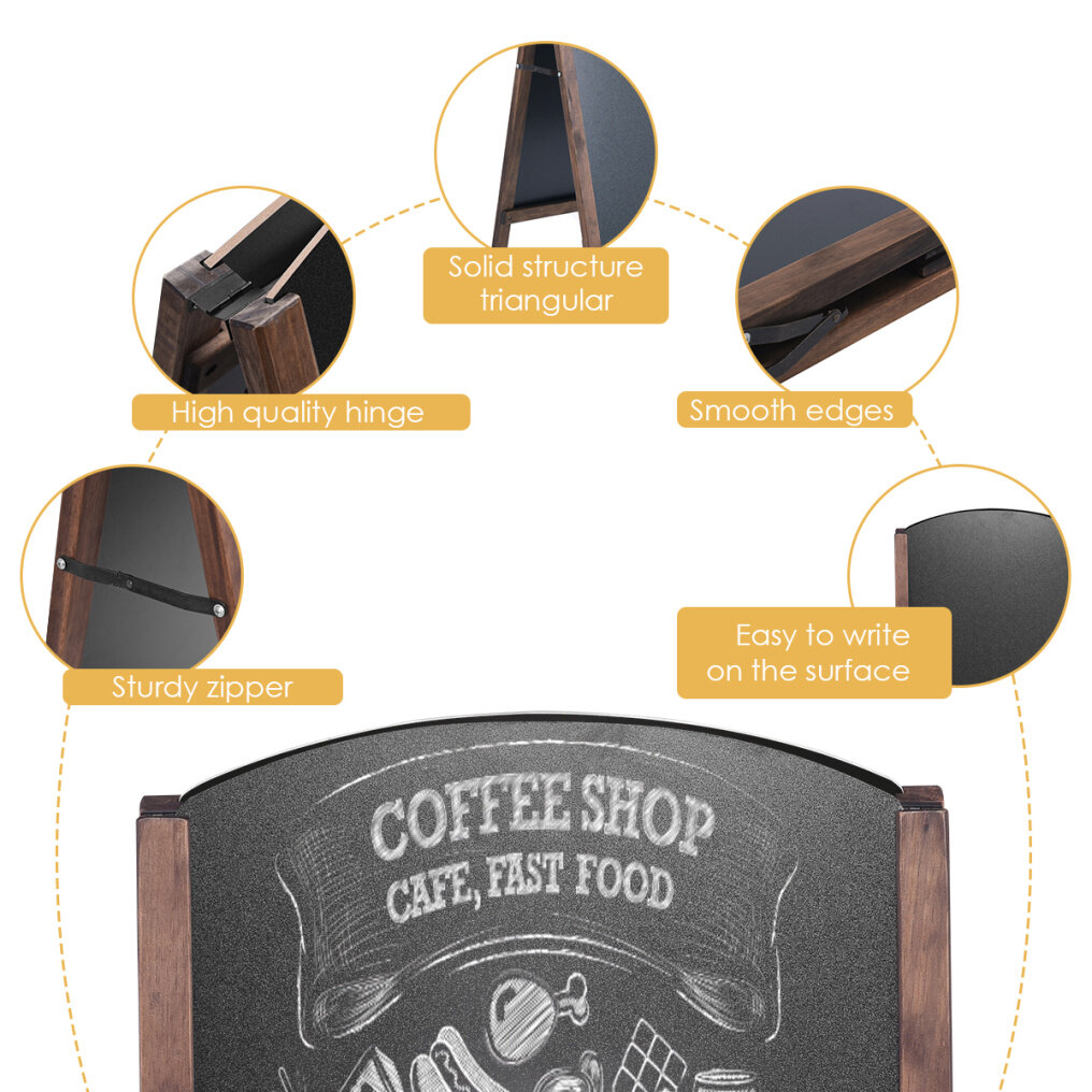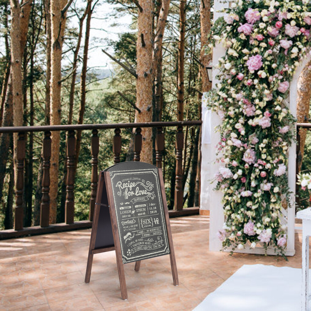 With solid pine wood legs, and a durable MDF chalkboard, this sandwich board sign will withstand winds and last for years. Featuring 2 sides makes this menu chalkboard incredibly convenient for switching between “open” and “closed” signs. Dual blackboards provide ample writing space for promotional messages. If you want to make changes to your sidewalk sign or simply want to touch up the artwork on your display, you can wipe the sign with a damp cloth. You can start creating new ideas right away! You can use liquid chalk markers as well as standard chalks on this board. These rustic sidewalk signs are designed for many occasions, enhancing the look of any event or business. Suitable for business, restaurants and weddings, retail stores, restaurants or cafes to advertise happy hours, promotional items!