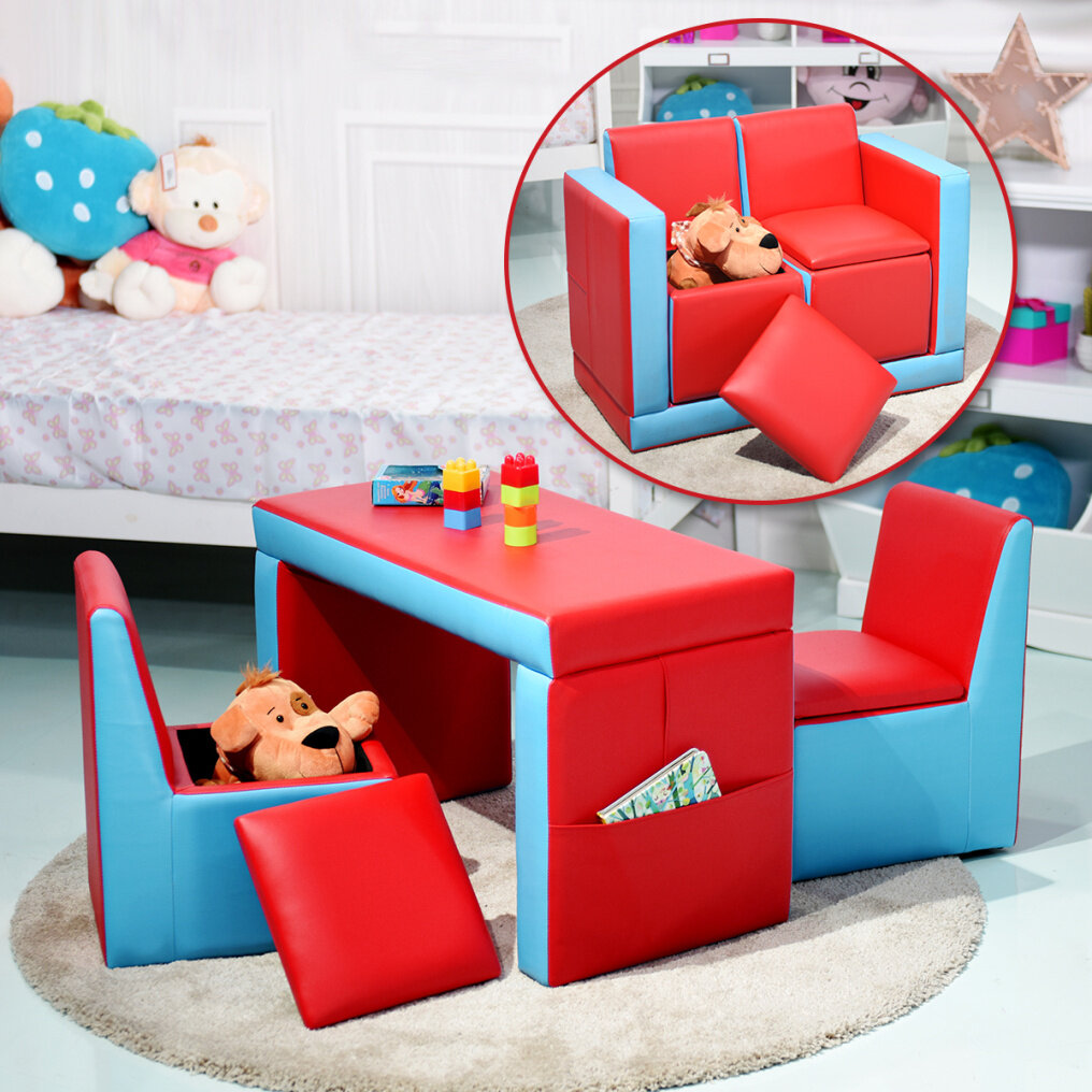 With a cute set, kids will be more likely to settle down and start to learn or just read. The 2 in 1 sofa & kids table and chairs set is just the ideal choice which can accompany with your child from 3 to 9. It can be formed as a couch and separated into two chairs and a table for kids. Your kids can sit onto watch TV or read books in complete comfort. Our sofa is great for entertainment and leisure. This child-sized set is suitable for any place, no matter outside or indoors. There’s an extra storage box under the seat. Toys and books will be accessible with this sweet design. Kids can take out their toys and books underneath and have a seat to play and read. A perfect present for children!