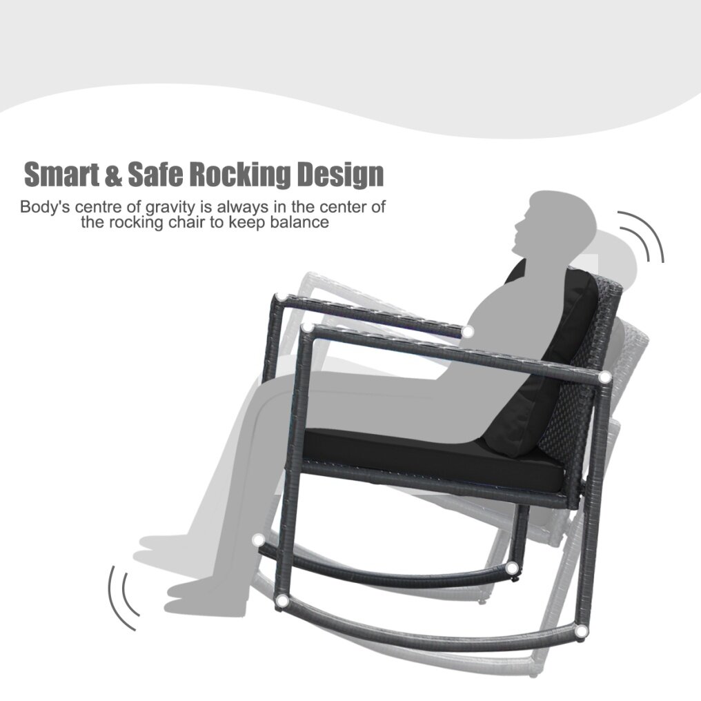 With the 2 chairs and 1 side table, you can comfortably read, drink coffee or listen to music with your family or close friend. The wide backrest, ergonomic armrests and sponge-padded cushions provide a comfy sitting experience. Also, you can put your drinks, snacks, books or other items on the tempered glass tabletop or the storage shelf at the bottom. While there are stains on the tabletop or the cover of seat cushions, it is easy to remove and clean them. And owing to the weather-resistant PE rattan and strong steel frame, this 3 PCS rocking chair set is stable enough and can serve outdoors for a long time.