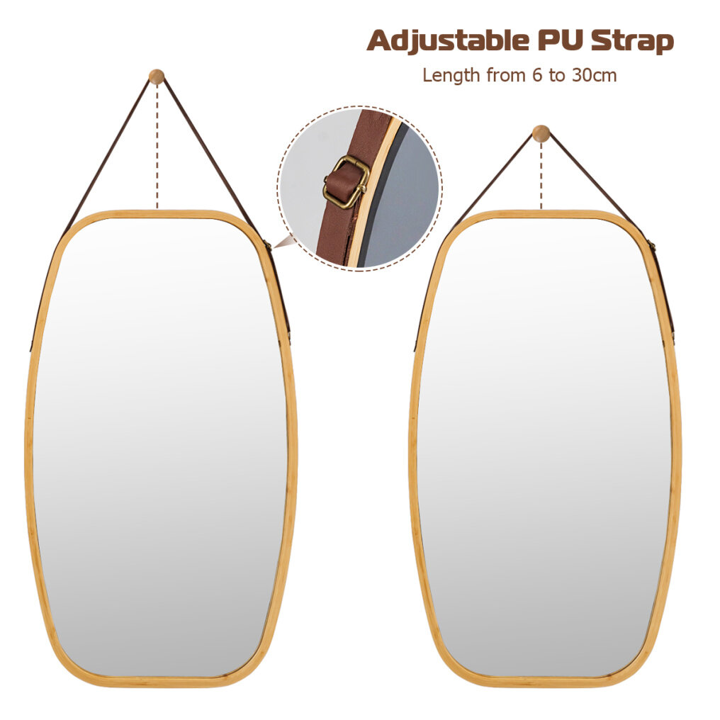 Sturdy Bamboo Frame: The wall-mounted mirror is constructed by superior bamboo frame, glass mirror with clear reflection and leather strap. After a fine manufacturing process, the thickened bamboo frame with round corner makes sure the sturdiness and durability without easy deforming and cracking. Besides, the explosion-proof membrane behind it ensures safe use.