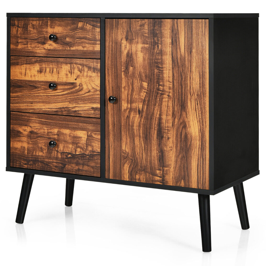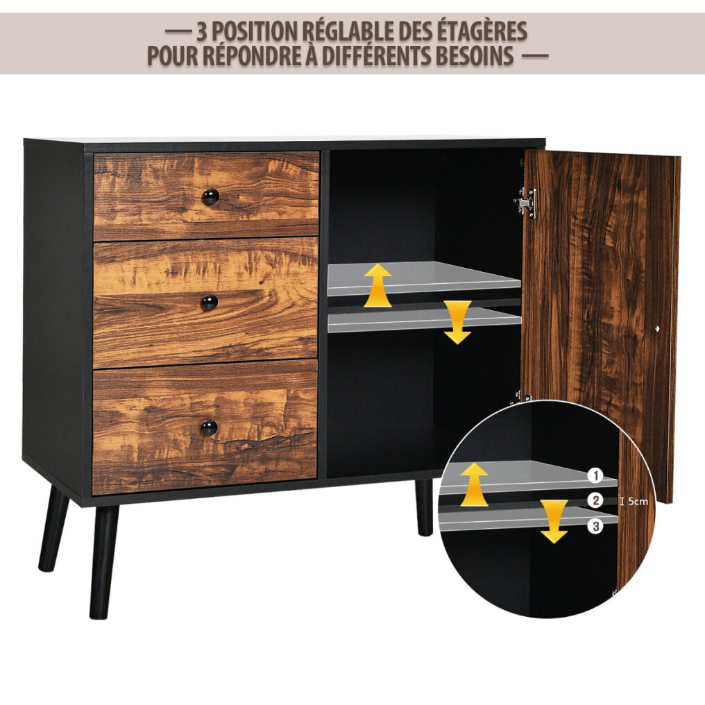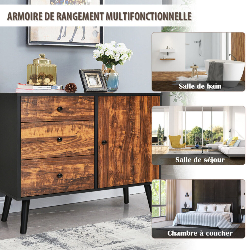 3 drawers and 1 side cabinet allow you to store various belongings, such as clothes, tableware, books and toys, etc. Furthermore, the adjustable shelf is convenient to put items of different heights. This freestanding sideboard is made of premium engineered wood which is durable and stable to hold up to 74kg. Besides, the retro style makes this storage cupboard not only serves as furniture, but as home decoration. Therefore, it is suitable for the living room, bedroom, kitchen and other places.