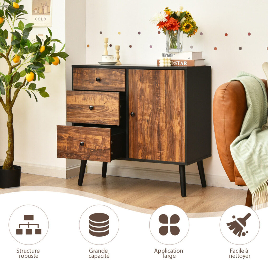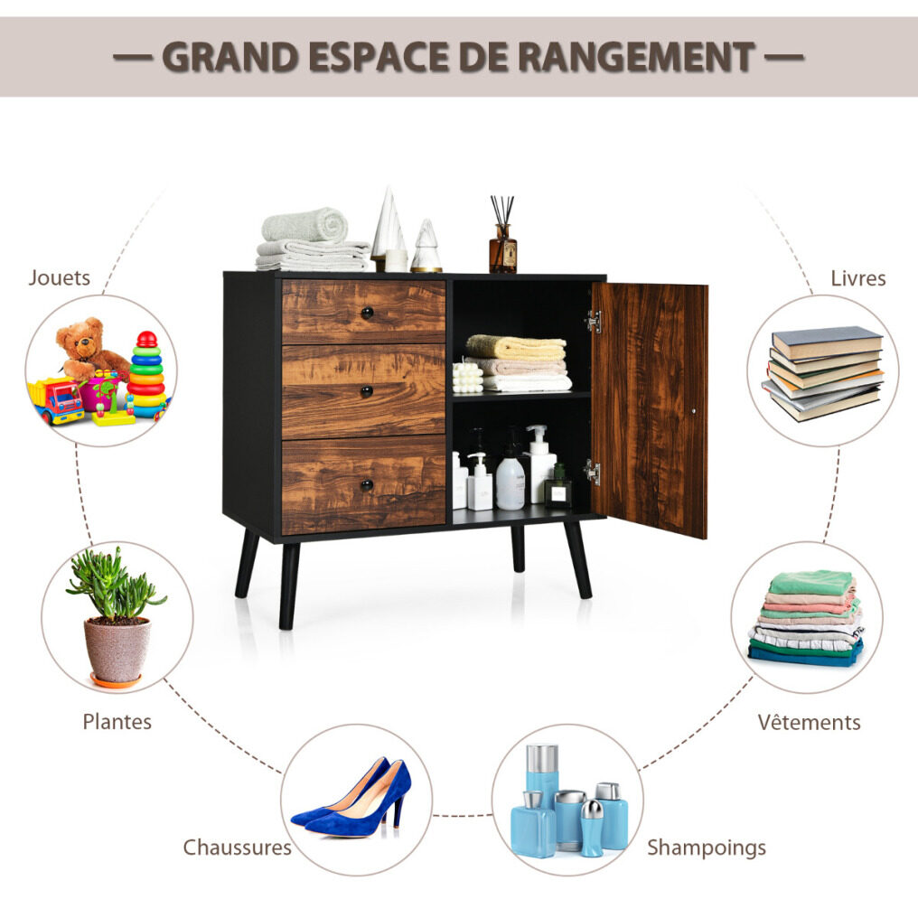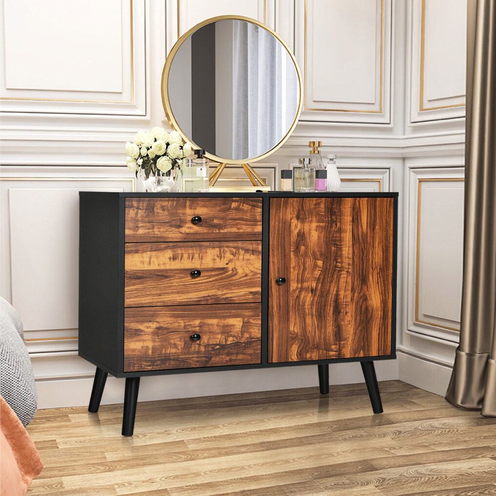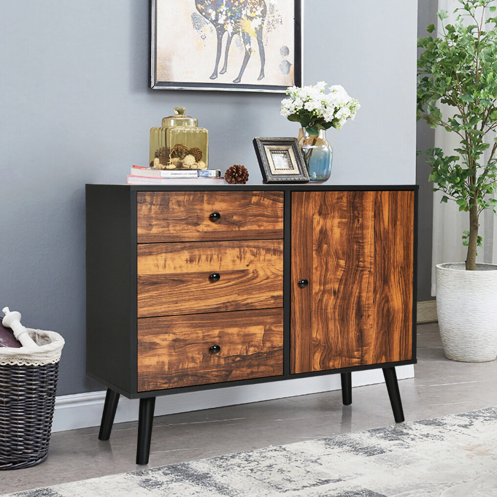 3 drawers and 1 side cabinet allow you to store various belongings, such as clothes, tableware, books and toys, etc. Furthermore, the adjustable shelf is convenient to put items of different heights. This freestanding sideboard is made of premium engineered wood which is durable and stable to hold up to 74kg. Besides, the retro style makes this storage cupboard not only serves as furniture, but as home decoration. Therefore, it is suitable for the living room, bedroom, kitchen and other places.