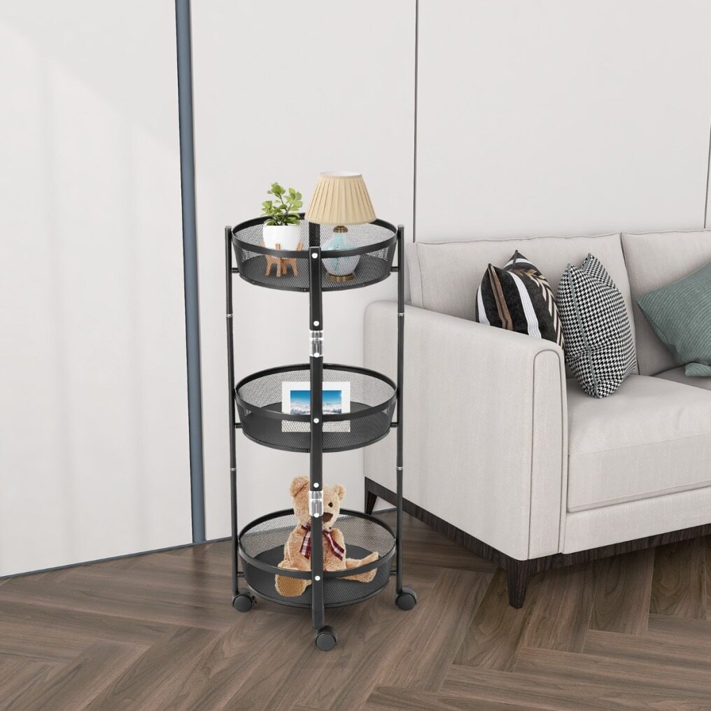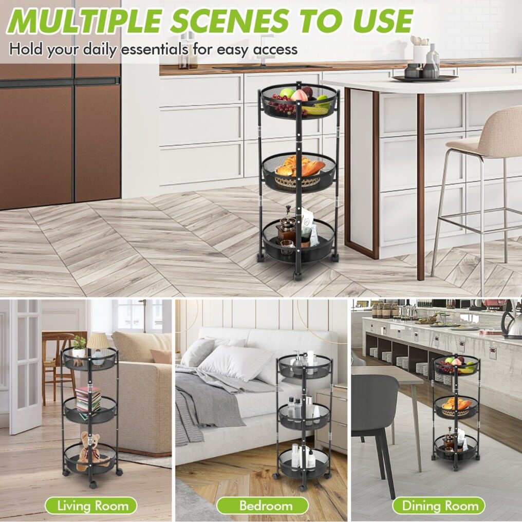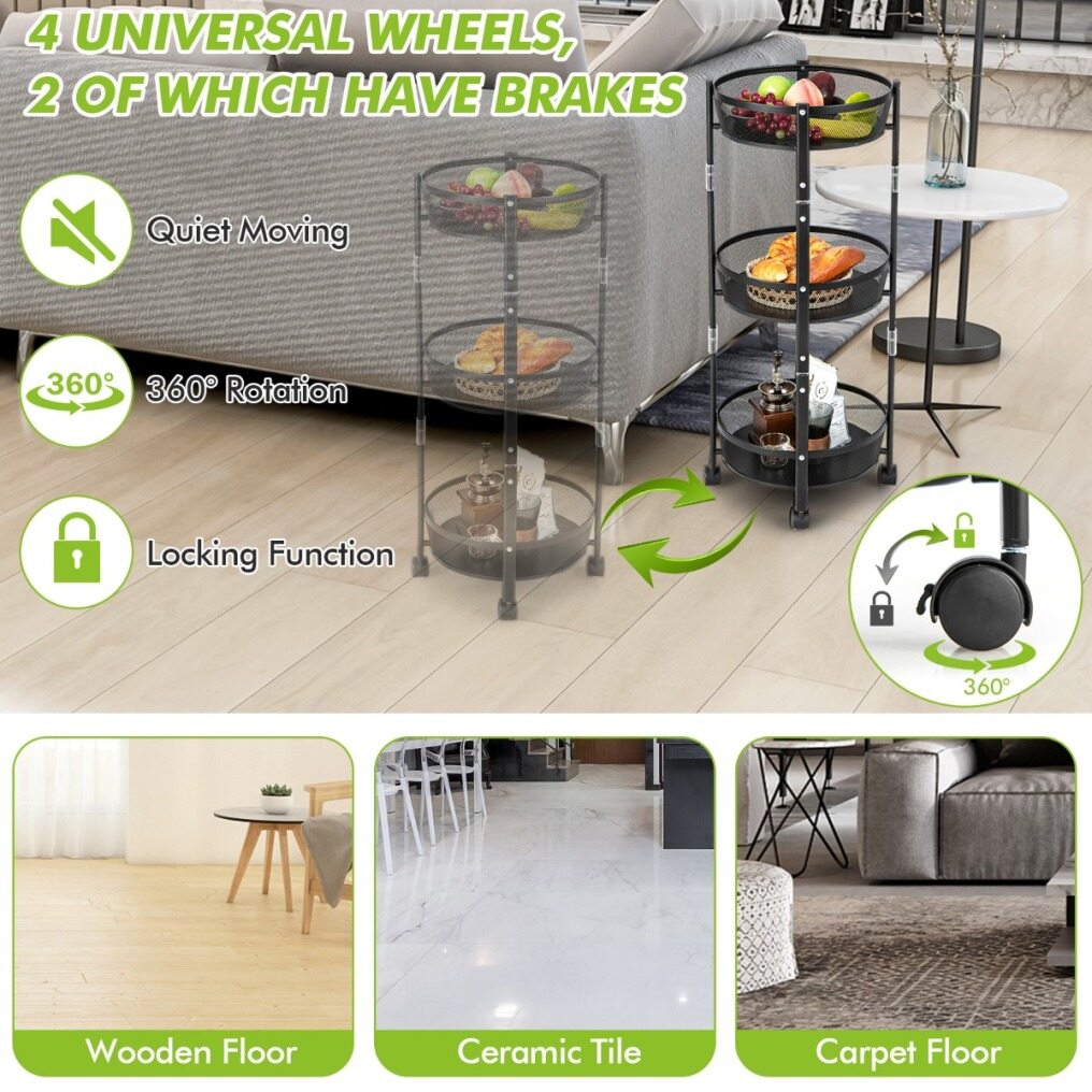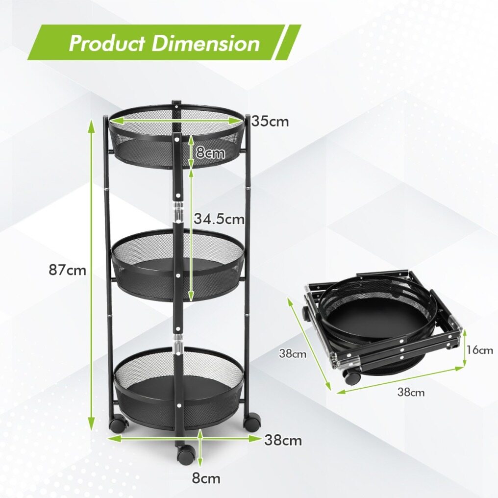 Though compact, the 3-tier fruit basket stand features a large storage capacity. You can store and classify plenty of daily essentials in the 3 breathable metal baskets. The durable metal and sturdy construction ensure long service life. 4 smooth rolling casters endow the utility cart with smooth mobility. And 2 lockable casters help you lock the storage basket stand in a breeze. More importantly, the rolling trolley doesn’t require assembly and can be opened or folded in a flash. You must be surprised to discover just how easy and convenient it is!