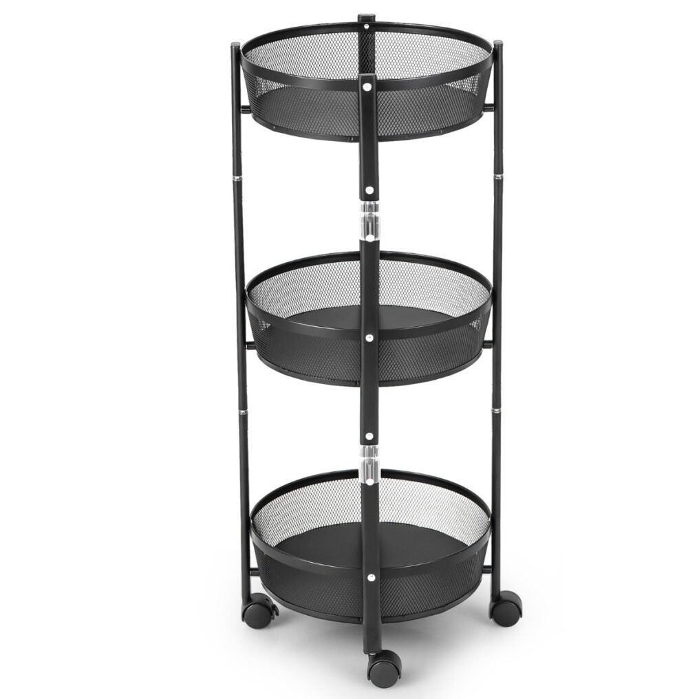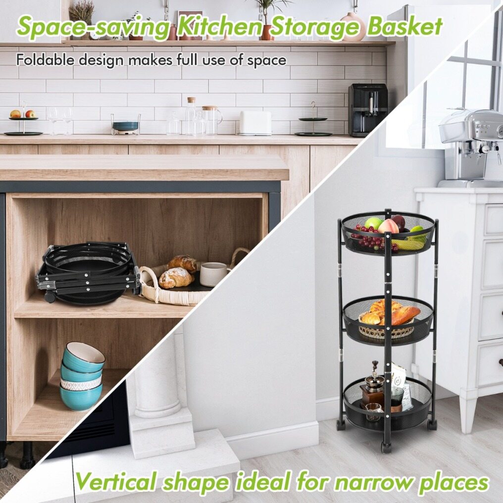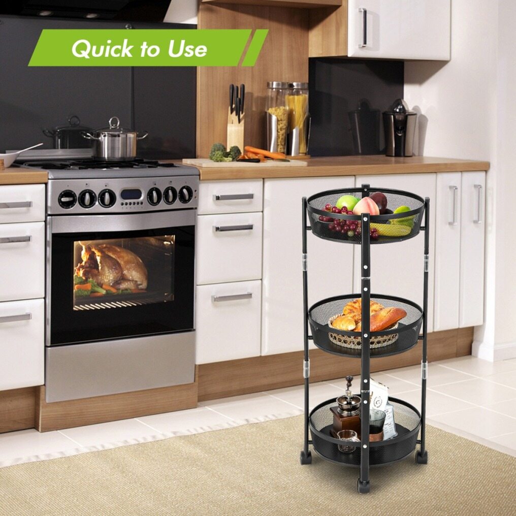 Large Storage Capacity: This 3-tier fruit basket stand on wheels provides sufficient storage space for a variety of items, such as fruit, vegetables, spice jars, cups, drinks and snacks, which is a wise storage solution to keep your kitchen clean and tidy. Meanwhile, the mesh baskets promote good airflow.