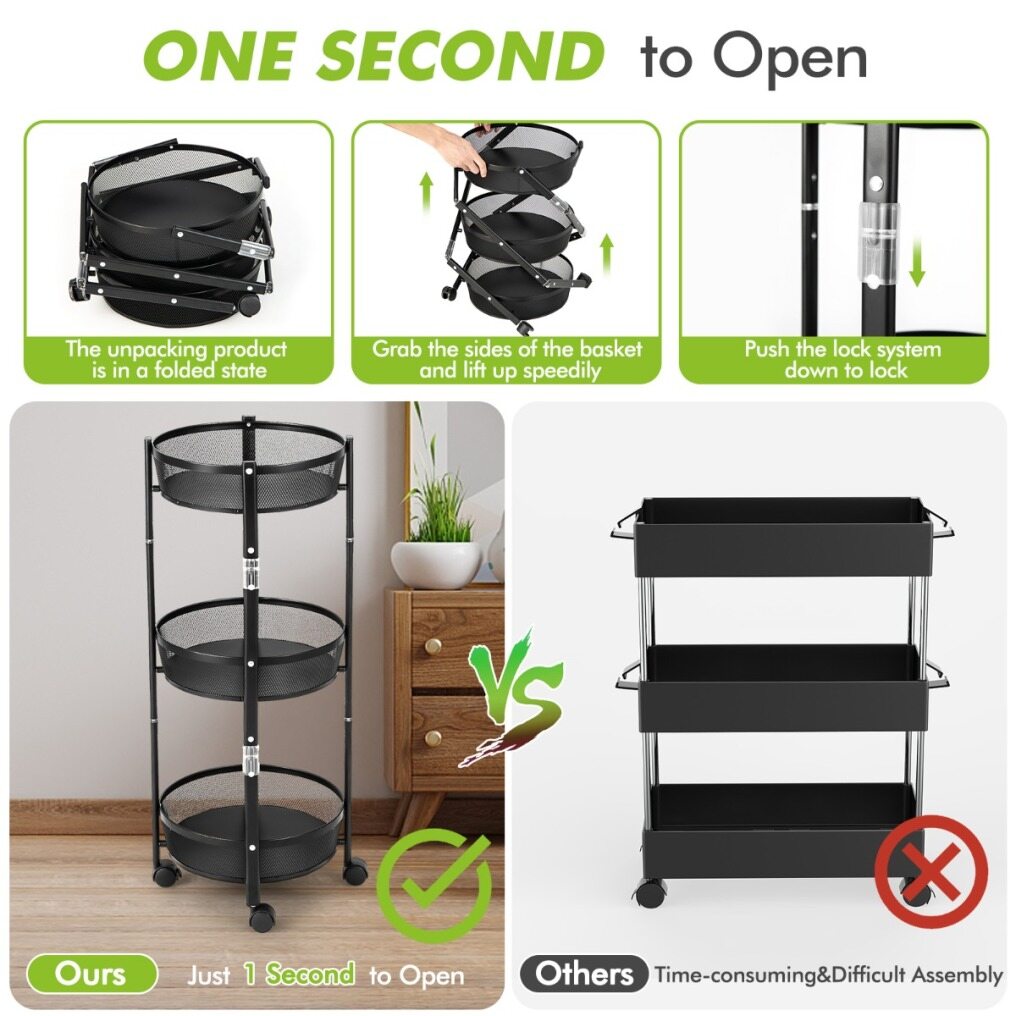 No Assembly Required: Adopting advanced one-second folding and opening technology, this 3-tier utility rolling cart frees you from complicated installation. Just pull it up in 1 second and fix the locking system. When not in use, you can fold down the cart instantly into a compact size and store it in your cupboard.