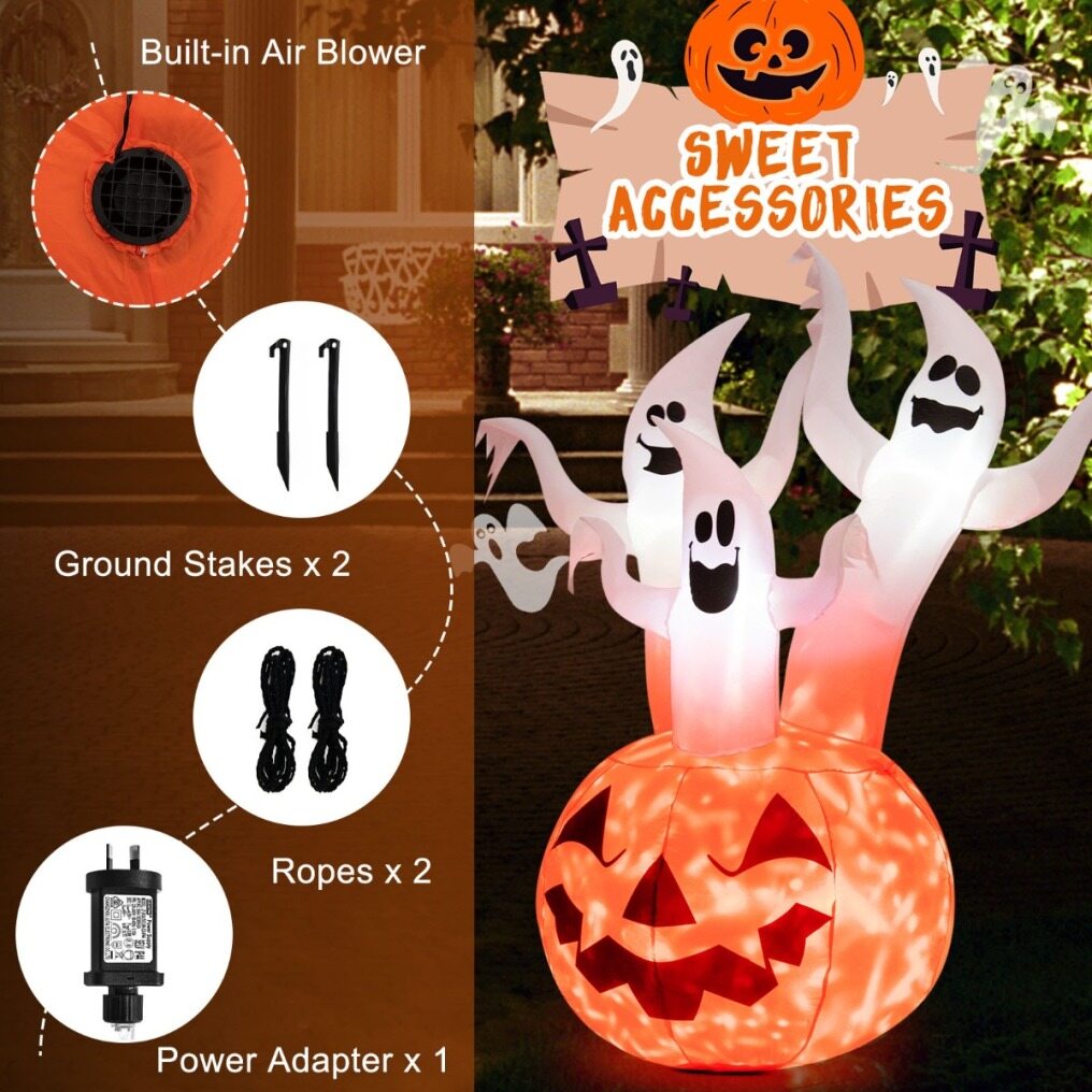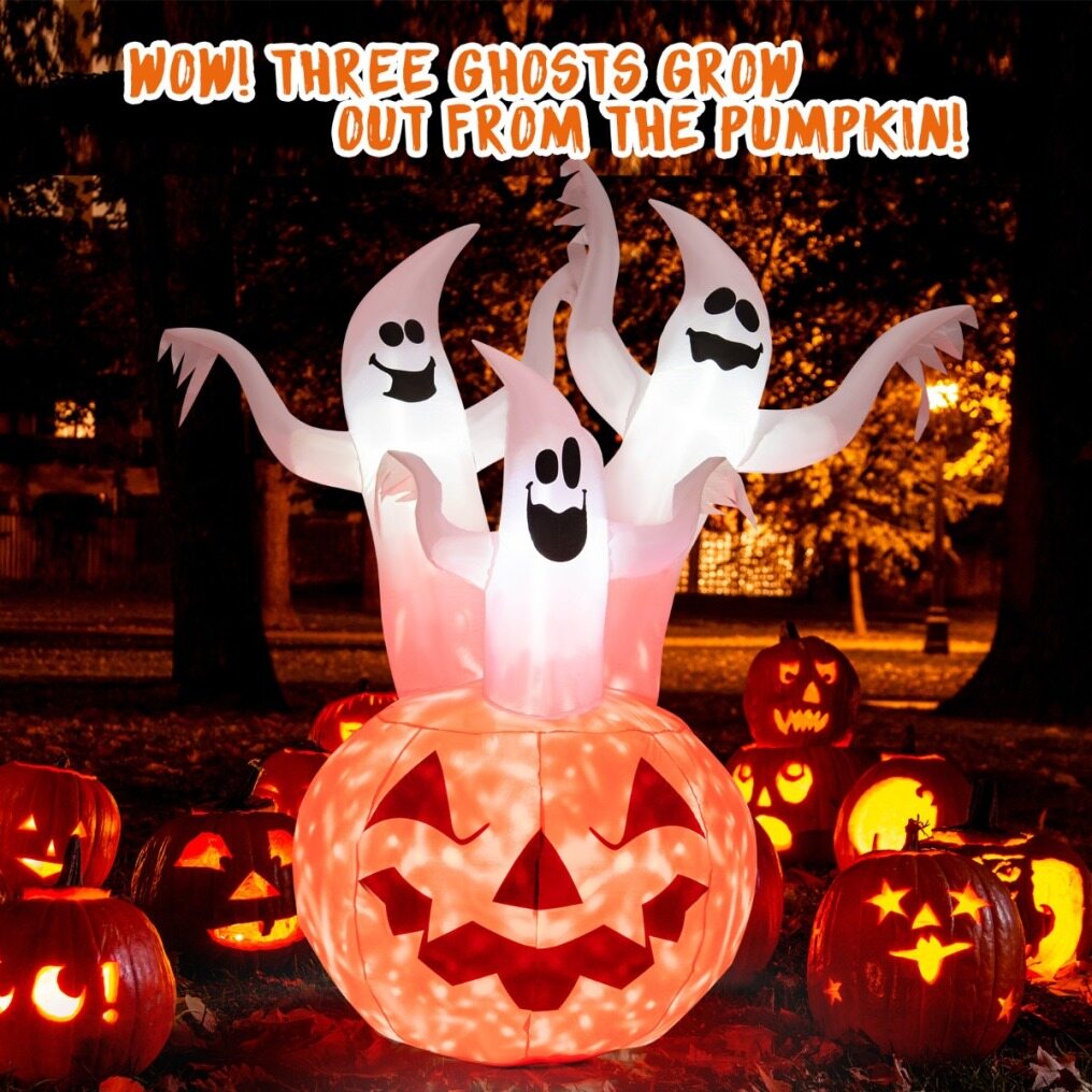 Adorable Appearance & A Great Halloween Gift: This inflatable Halloween decoration is based on a large Halloween pumpkin, and on which there are three scary ghosts. The three ghosts hold out their hands with very vivid expressions, which will bring a cheerful atmosphere to Halloween night!