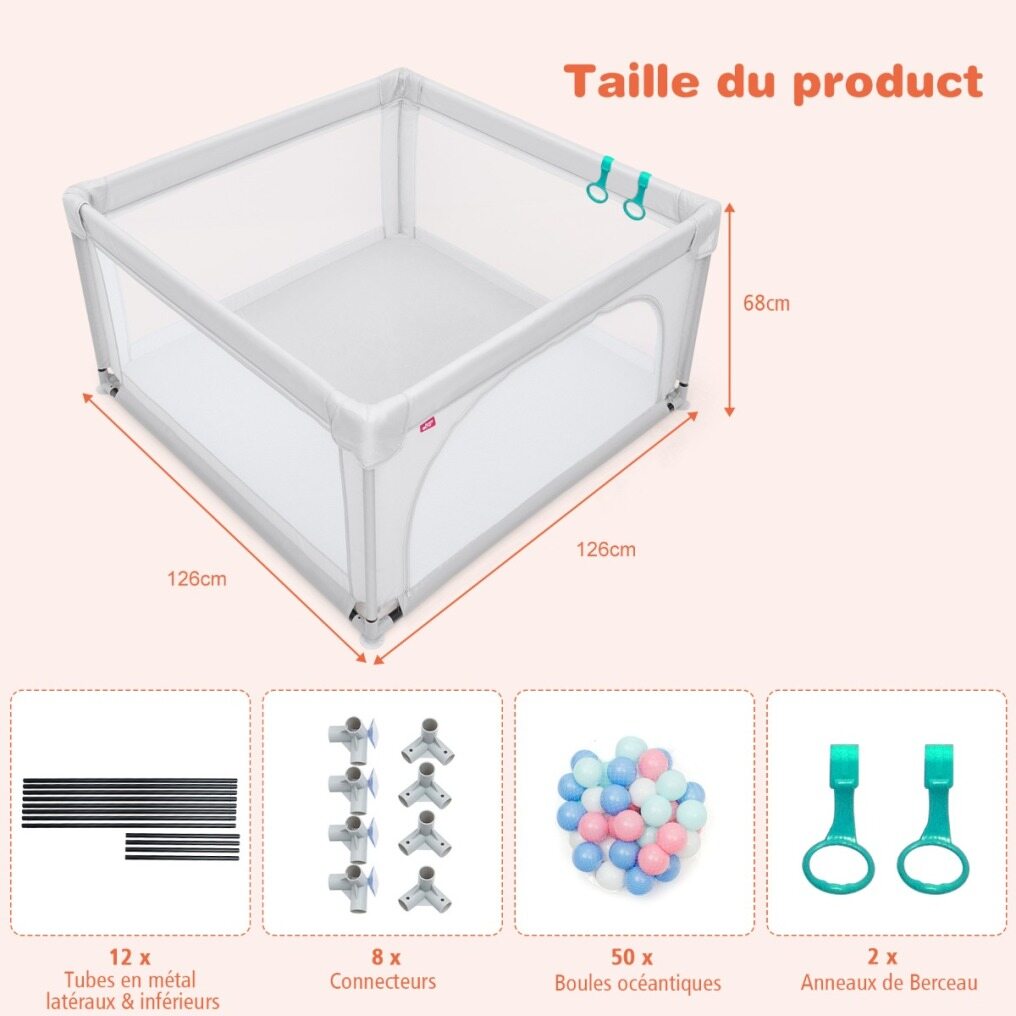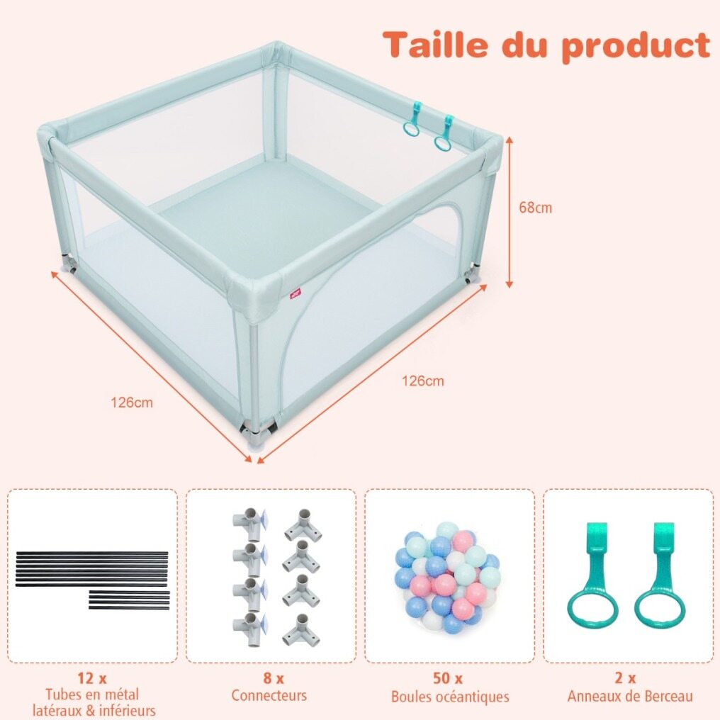 Parent's Litter Helper: With the help of baby Playard, parents don't need to look after their babies all the time and they will have more time to do their own business. At the same time, babies can develop their awareness of independence at an early date or play with friends and are surrounded by colourful ocean balls (50 balls included) for extra fun.
