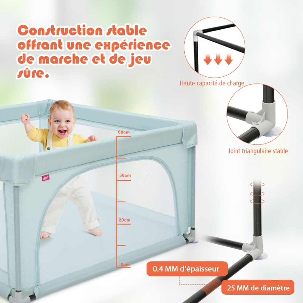 Perfect Size Play Area and Scientific Height: The baby playpen the dimensions of 120 x 120 x 68cm, and provides enough safe playing space for the baby. It's perfect for a compact room or travelling to use. The height of the fence is high enough for the baby to stand and walk while having enough area inside the playpen to explore around.