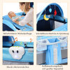 This convenient cot offers a safe environment for your baby to sleep or play that can be taken down when not in use. With an extra cot lining, we can offer 2 heights for your child to sleep, allowing the cot to be used with the really young and the older baby. Also included is a removable changing mat for those all important nappy changes. A convenient removable storage bag hangs from the side allowing you to keep spare nappies, cream and wipes, with a space for a bottle for the night time feed. A mosquito net and hood, finished off with 3 hanging soft toys to keep your baby amused, completes the item.