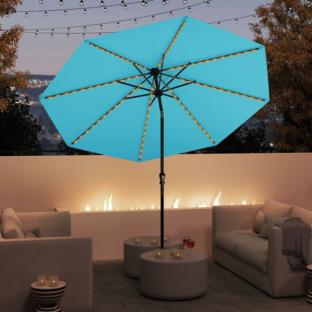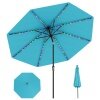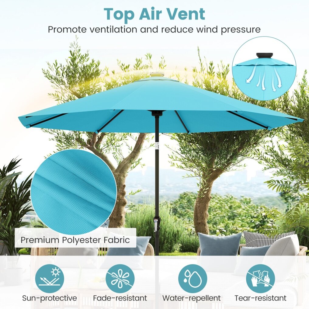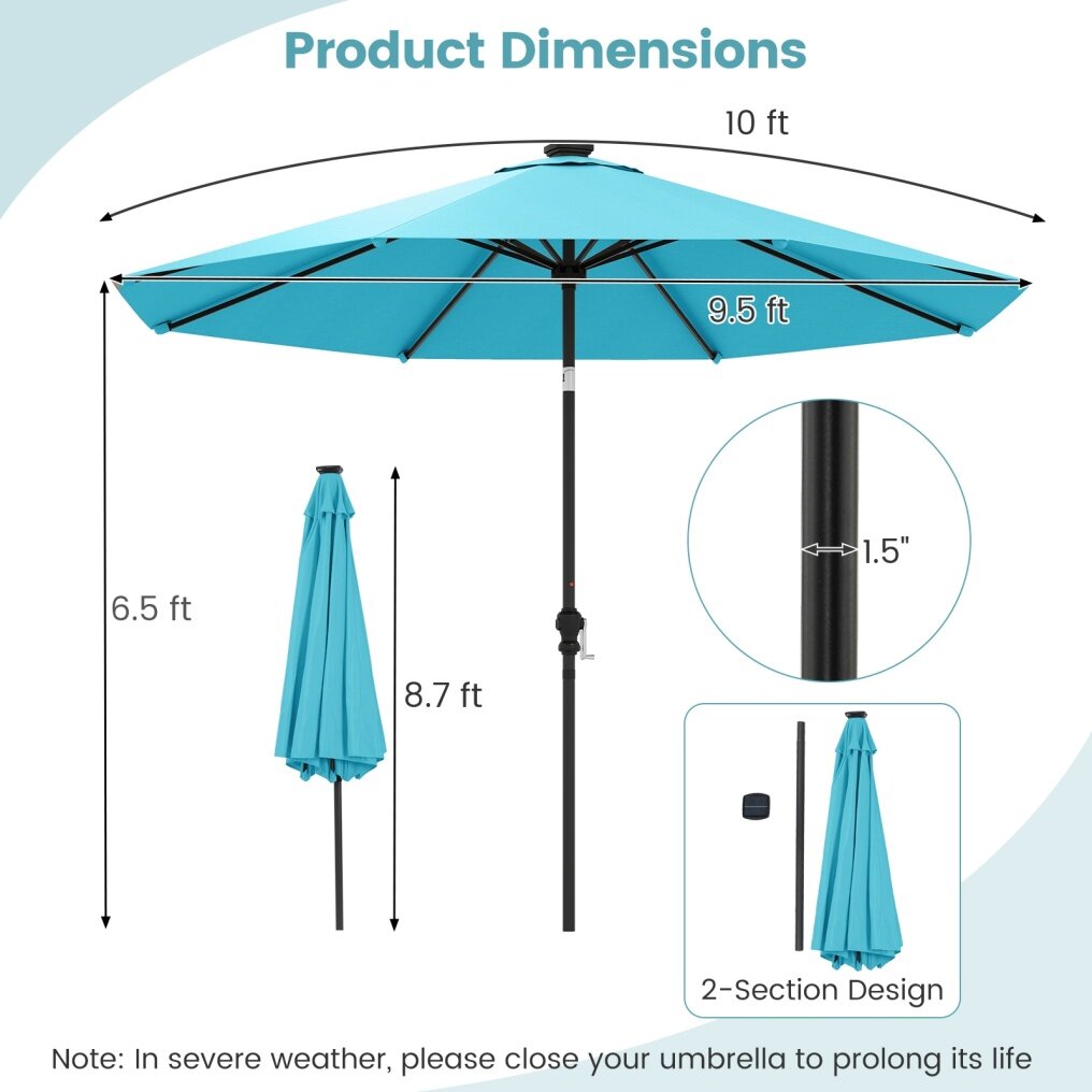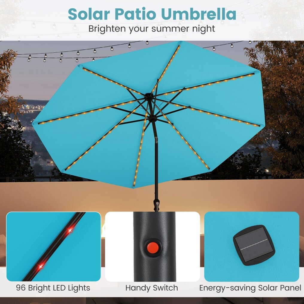 ●Vibrant Lighting Display: This 10 ft patio umbrella is adorned with 96 bright LED lights, which offer 9 lighting modes, including 4 static colors (red/blue/green/white), 4 dynamic modes, and 1 multi-color mode, suiting various moods and occasions. The lights are powered by an energy-saving solar panel, and effortlessly controlled via a handy switch.