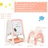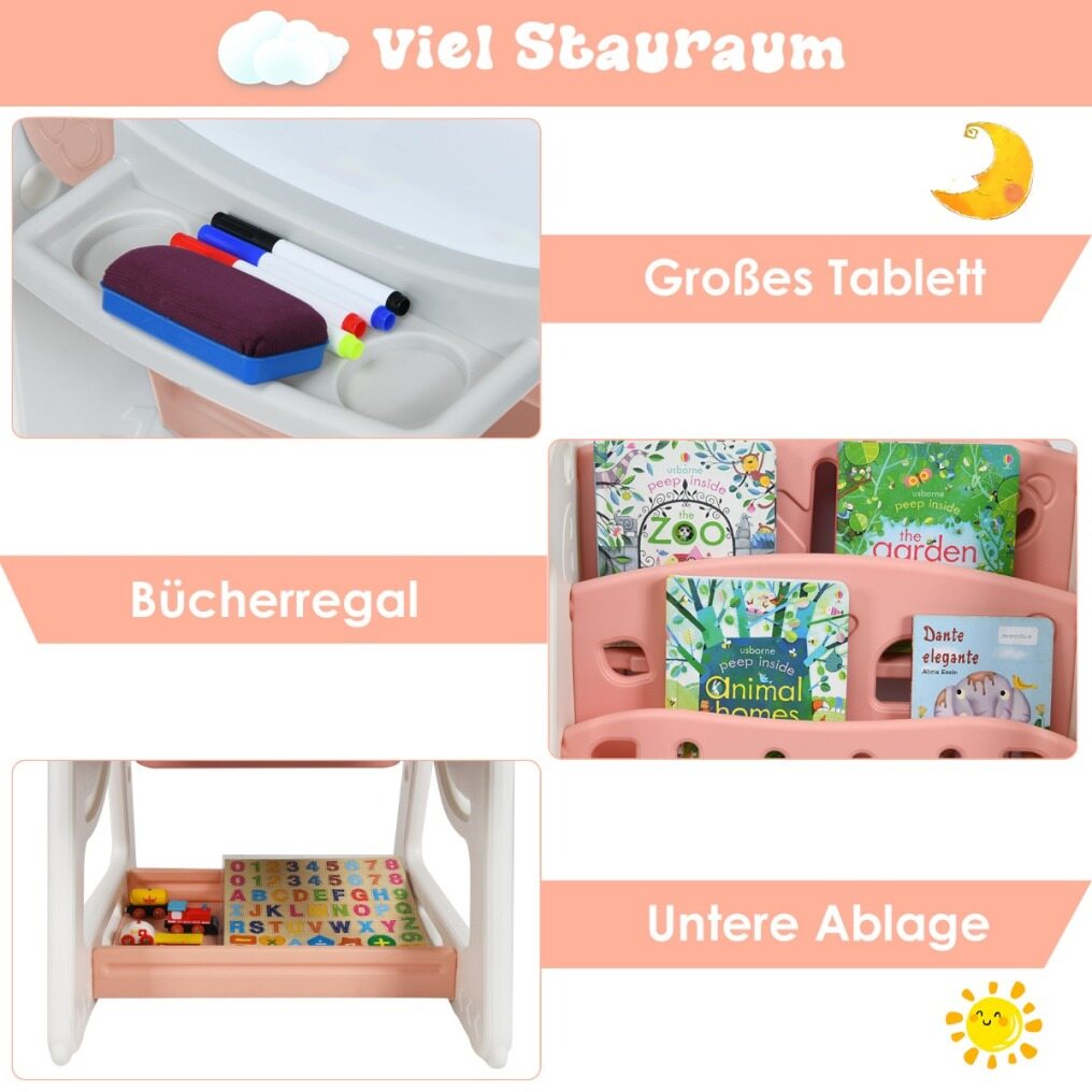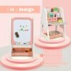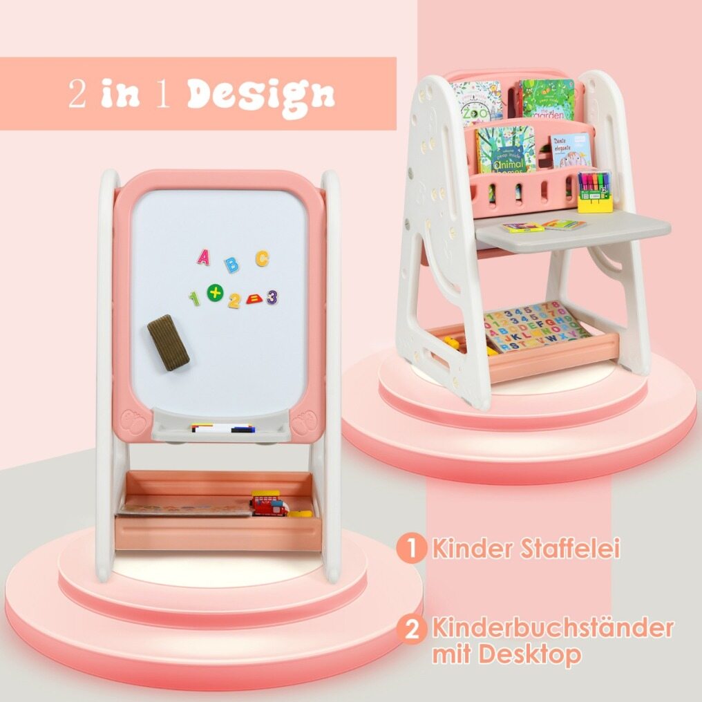 - 2 In 1 Design: Different from other Children's easels, this magnetic, dry-wipe board has a children's study desk with a bookcase on the other side. Complete with an ergonomic chair, this set allows your child to express their artistic talents on the one side then sit and read or complete homework at the desk.