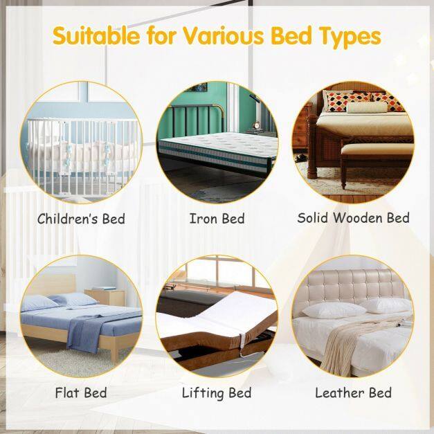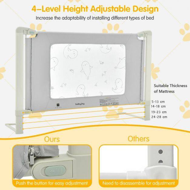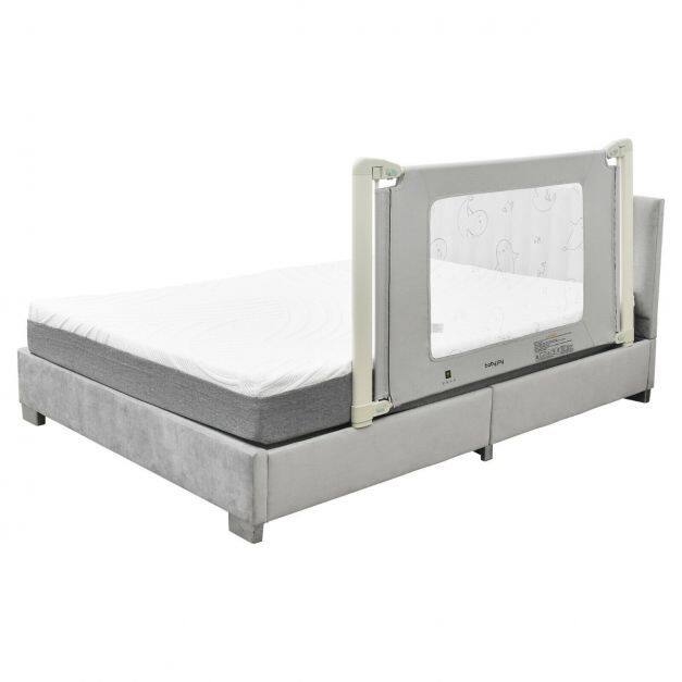 With an exclusive seamless design and double safety lock, this baby bed rail will be the perfect safeguard for your little one. Besides, 4 adjustable positions are suitable for different mattresses, such as twin, full and queen-size mattresses. And it can be lifted by one hand for great convenience. In addition, the sturdy iron frame with polyester wrapped not only provides superior stability but also keeps your baby safe. And it fits most beds. Most importantly, the installation is quite easy without other tools.