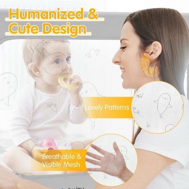 Sturdy Structure: Made of a high-quality iron frame with soft polyester-wrapped, this high-quality baby bed rail with T-shaped supporting legs offers strong stability while ensuring your little one’s safety. Meanwhile, the breathable mesh cloth with cute patterns allows you to take better care of your baby.