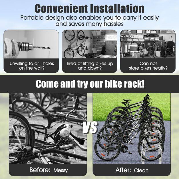 Wide Application: Each bike rack has several spacious positions for bike storage. You can park diverse types of bicycles in the rack, such as children's bikes, mountain bikes and stunt bikes. Plus, with a minimalist style that makes the rack blend well into various environment, you can place it in garden, garage and corridor.