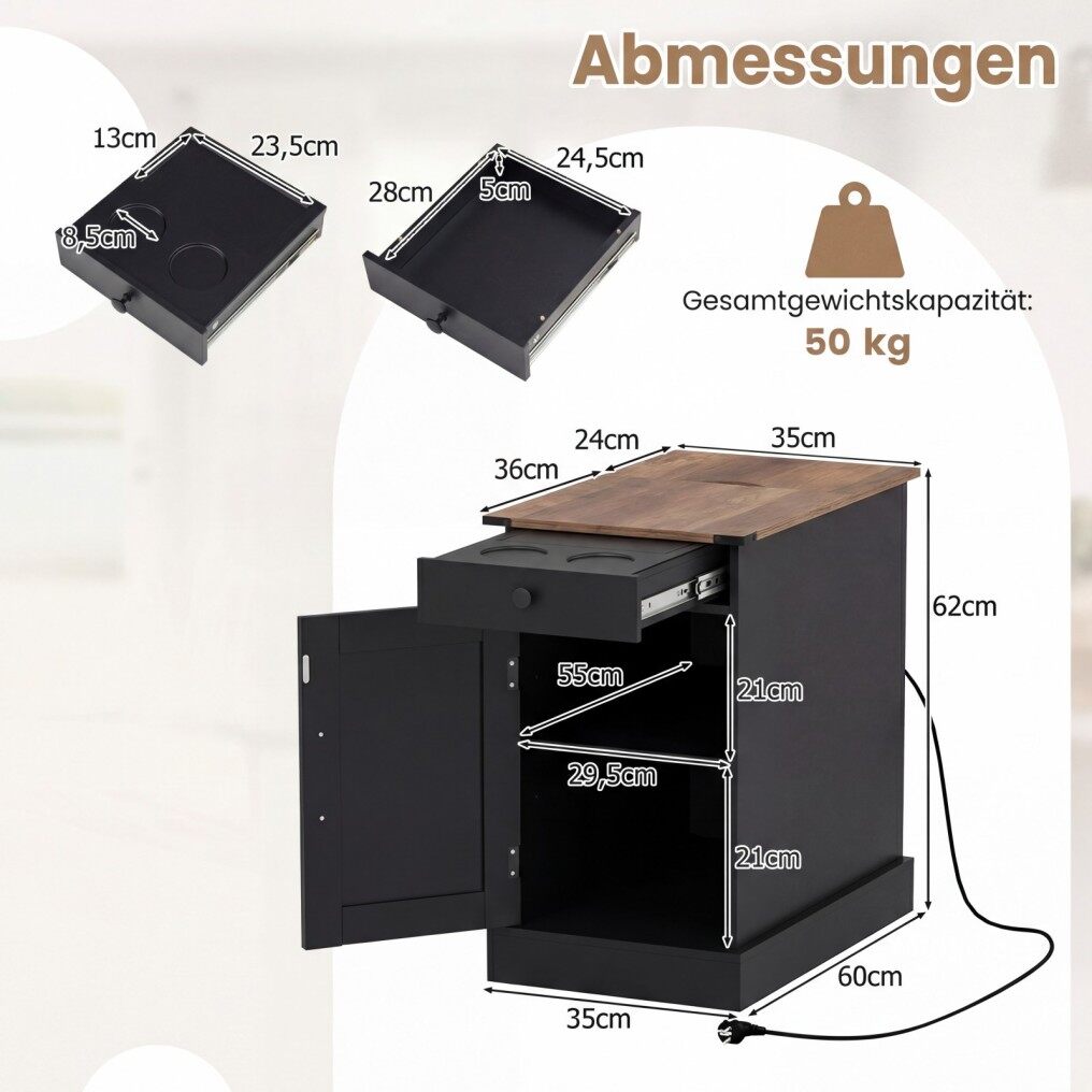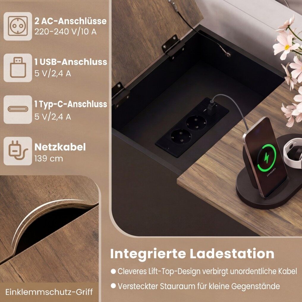 A touch of functionality and modern design enriches the home with this side table, which offers ample storage space for books, decorative items, or plants thanks to its generous tabletop, a practical drawer with a removable tray, and a single-door cabinet with a shelf adjustable to three different heights. The integrated charging station with two sockets, USB, and Type-C ports allows for the simultaneous charging of multiple devices, while the fold-down tabletop compartment provides additional space for small items and conceals cables.