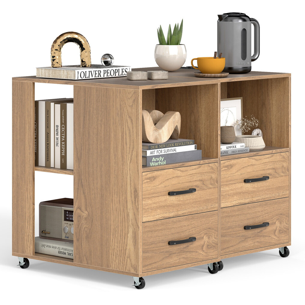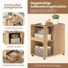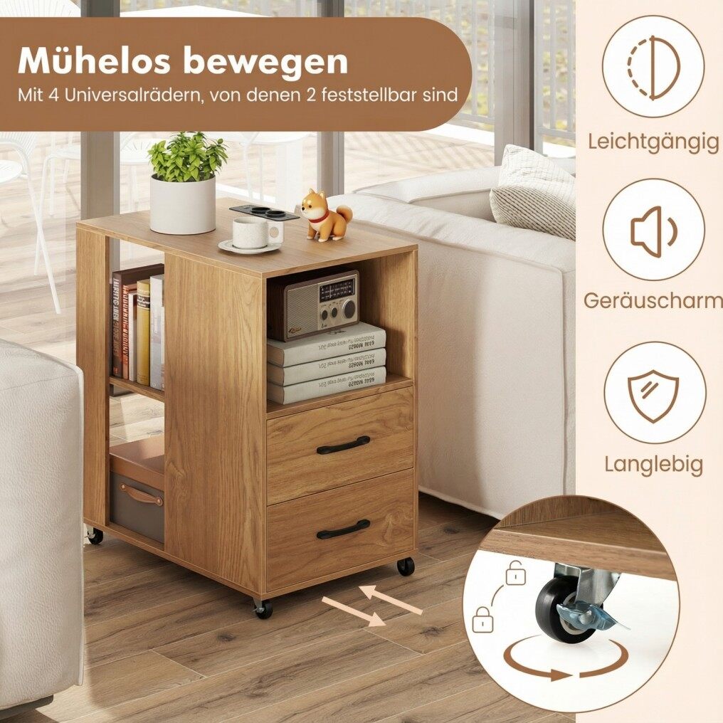 Double-sided storage function: The rolling side table offers a tabletop, an open compartment, and two drawers for easy organization. The back provides additional open shelves, ideal for storage and decoration.