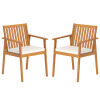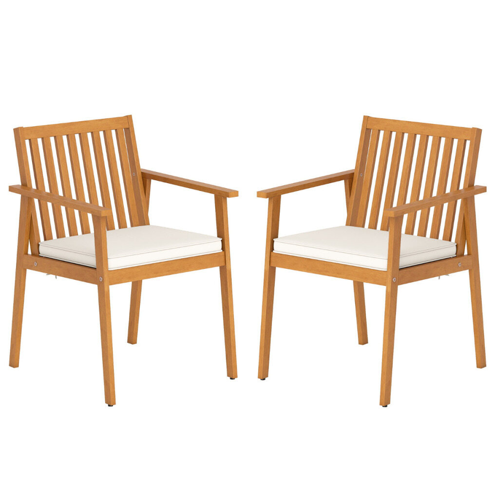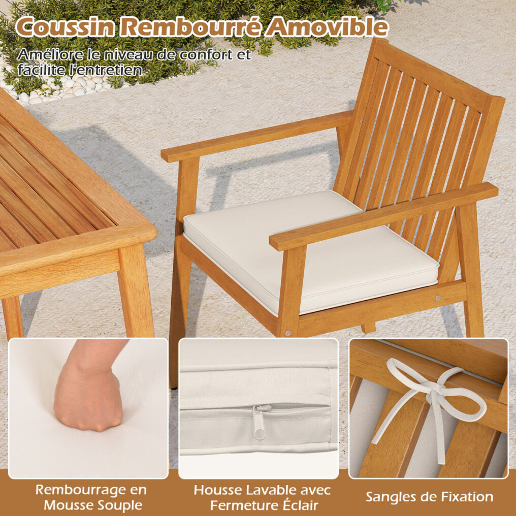 Made from natural acacia wood treated with teak oil, these outdoor dining chairs combine durability with remarkable stability. They also feature a removable, sponge-filled cushion to relieve hip pressure during long periods of sitting. The zippered cover makes cleaning easy, while straps ensure the cushion stays securely in place. Designed with an ergonomic backrest that conforms to the natural curves of the body for optimal support where it's needed most, the chair also features integrated armrests to enhance comfort and reduce fatigue. Adjustable glides are included to ensure stability on uneven surfaces.
