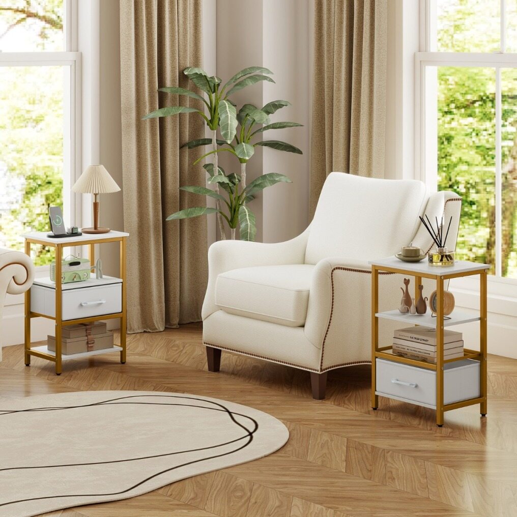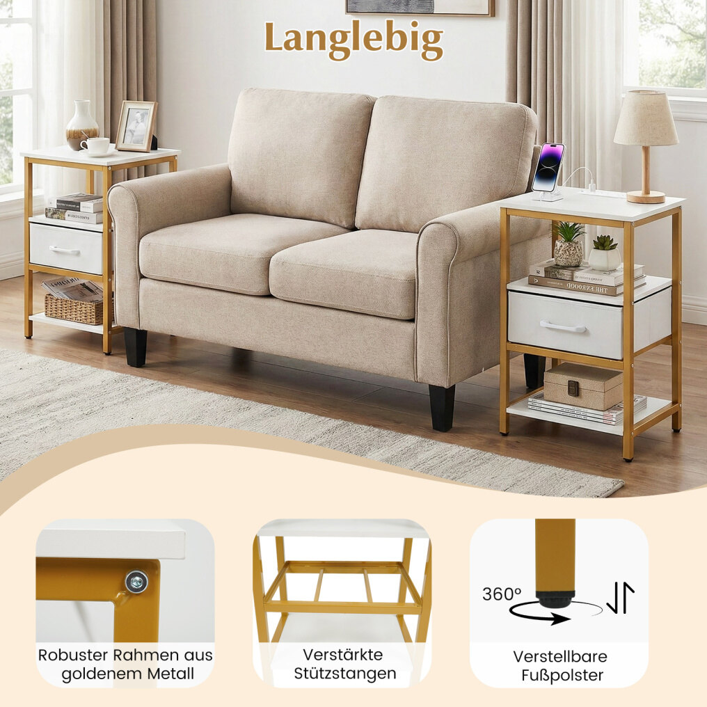 Stylish and versatile addition: The combination of white panels and gold metal tubes gives this nightstand a modern look. It fits perfectly next to a bed, sofa, or armchair, providing stylish storage and comfort in any room.