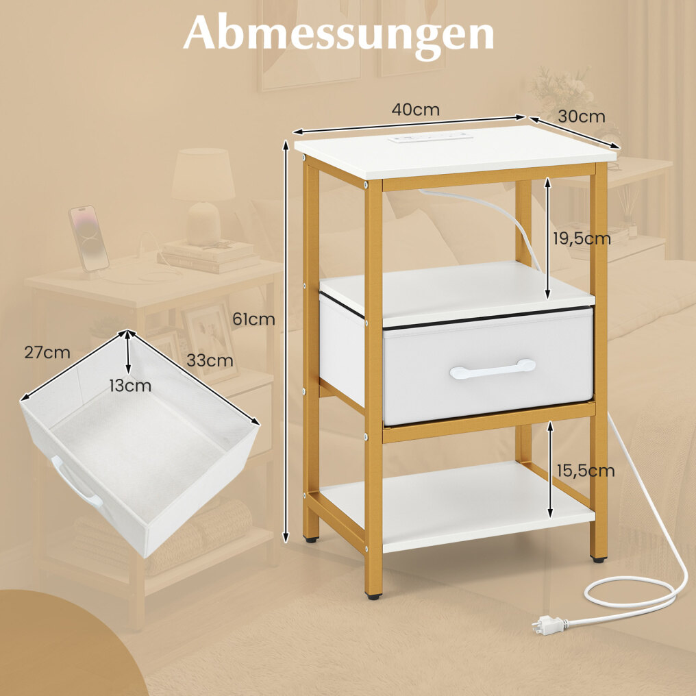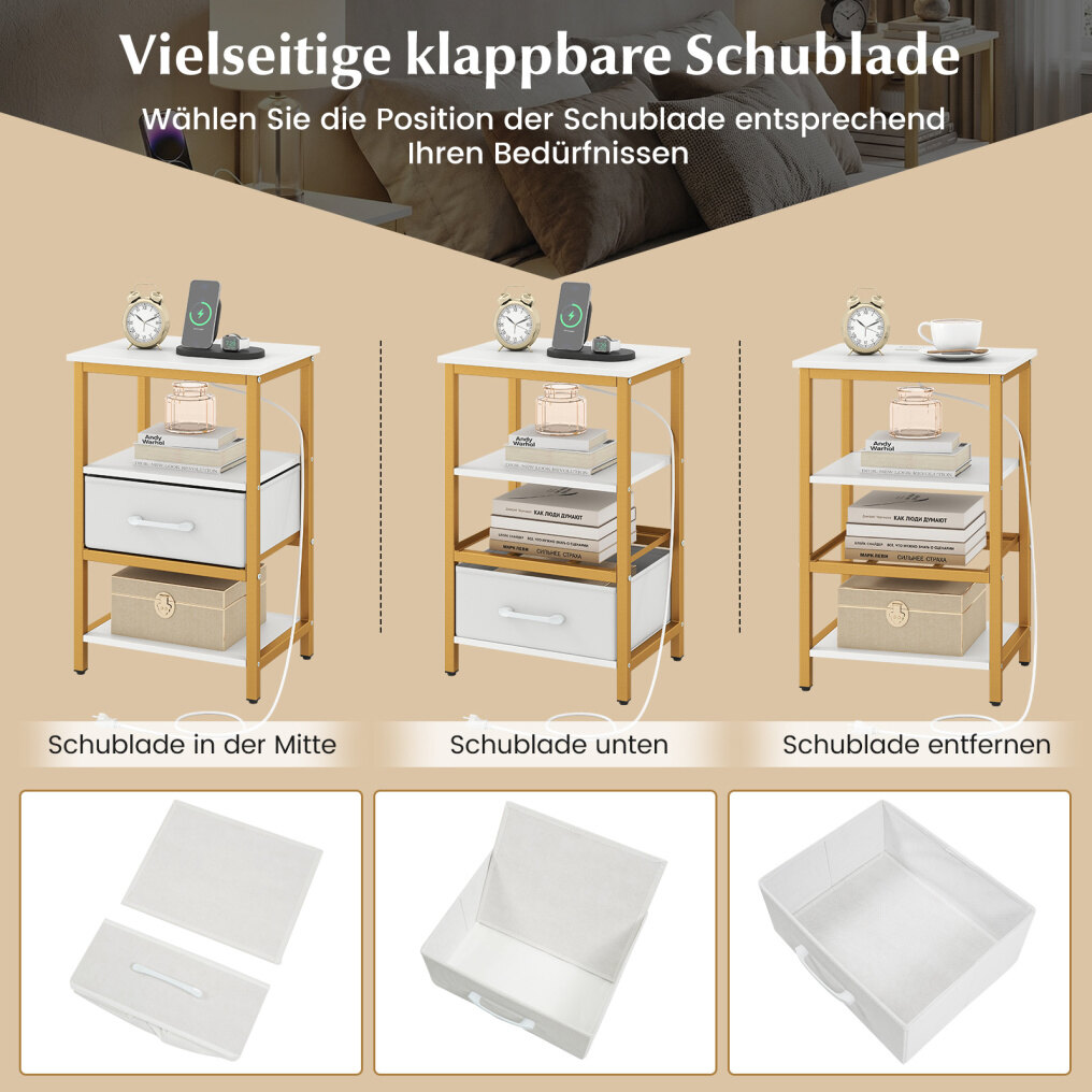 Give your living space a modern touch with this bedside table! The integrated charging station keeps your devices charged and within easy reach. The tabletop and open shelves offer practical storage space for everyday items or decorative pieces. The drawer, which can be attached in the middle or at the bottom and removed if needed, adapts flexibly to your requirements. When not in use, the drawer folds flat to save space. Made of a powder-coated metal frame with adjustable feet, this bedside table impresses with its stability and durability. Ideal for living rooms, bedrooms, or small spaces, it combines functionality with elegant design.