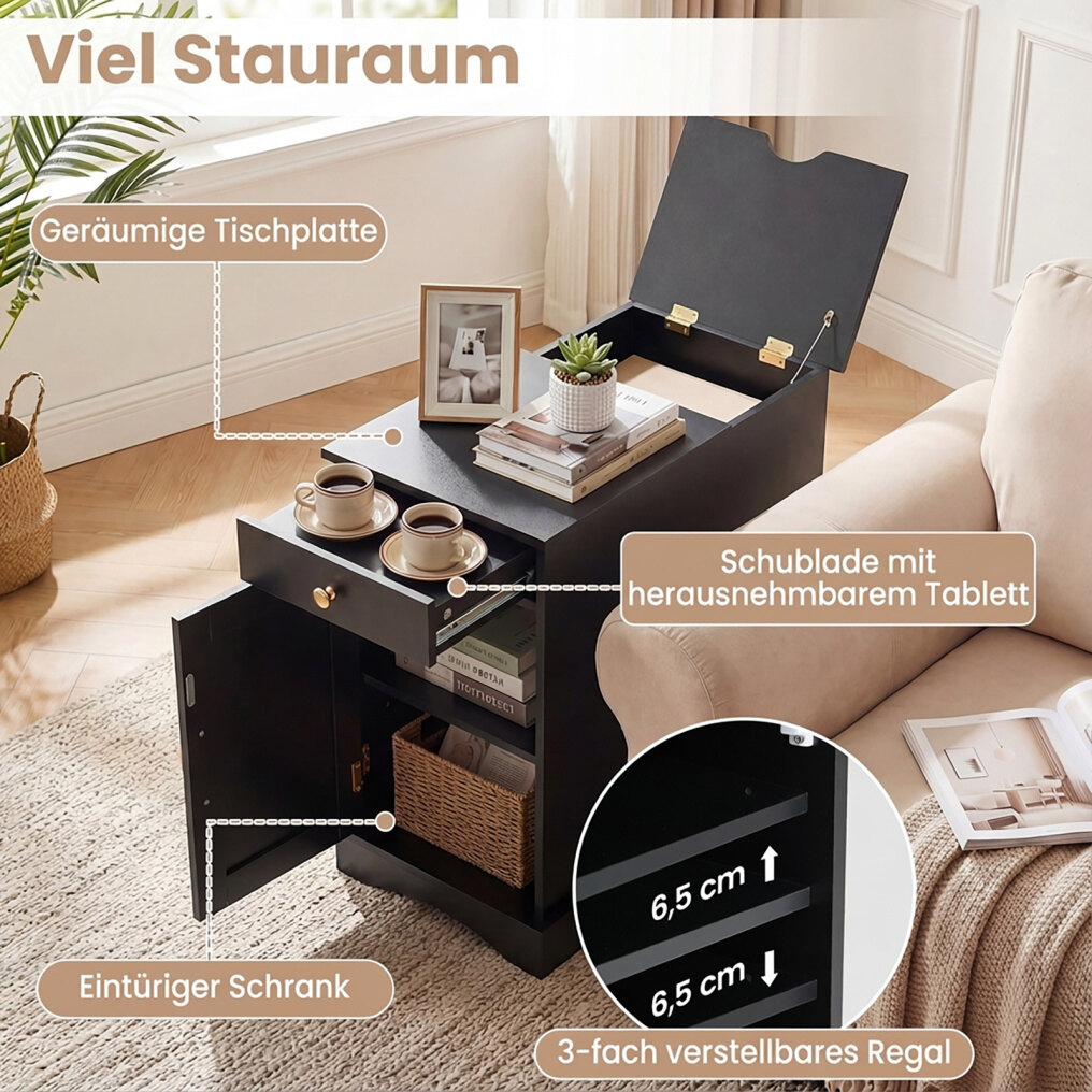 Adjustable shelf and removable tray : Inside the cabinet is an adjustable shelf with three height settings, allowing you to customize your storage space. The drawer contains a removable tray with three compartments for cups, remote controls, and other items, keeping essentials within easy reach.