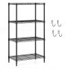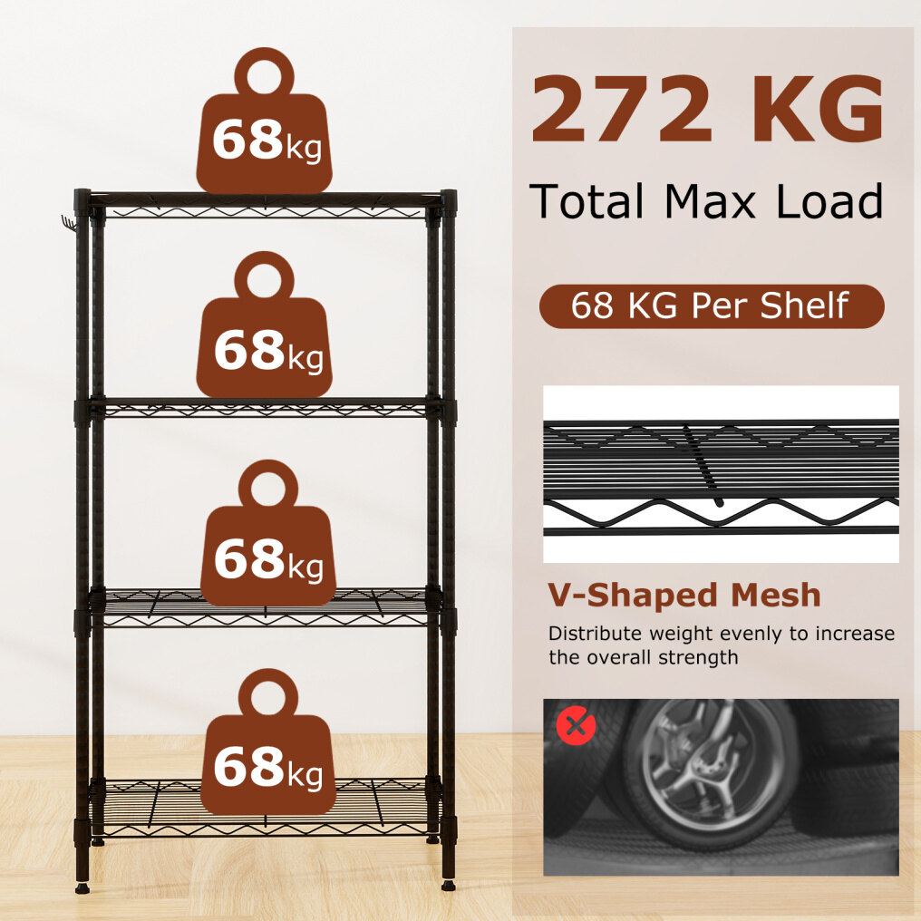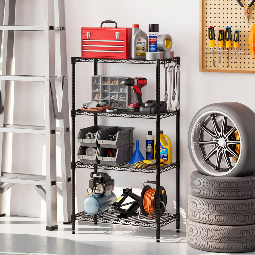 Improve your organization with a sturdy yet convenient metal shelving unit. This 4-tier storage unit features shelves that adjust in 2.5 cm increments to accommodate items of all sizes. Its robust metal frame with V-shaped mesh grids provides strong and reliable support. Quick, tool-free assembly makes installation easy, while anti-tip systems and adjustable feet ensure optimal stability. Organize with confidence using this sturdy shelving unit designed to secure and declutter your space.