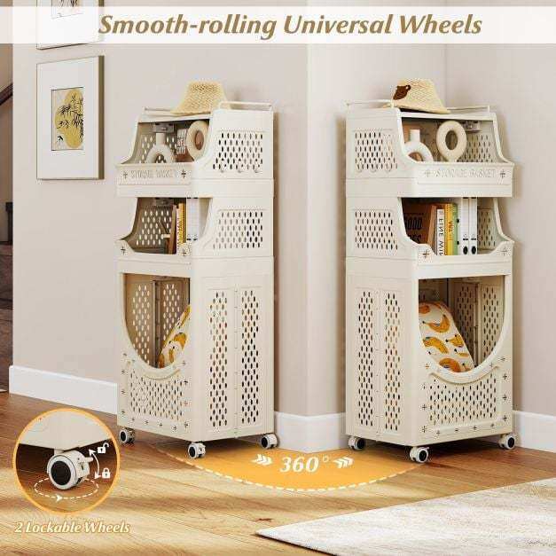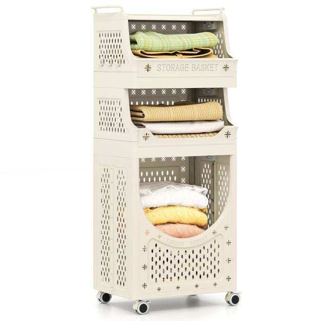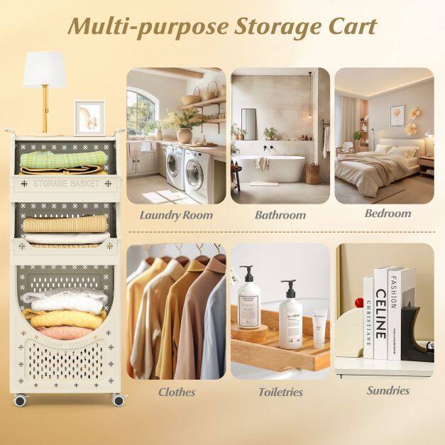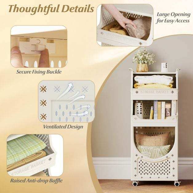 ● Thoughtful Details: Each basket in this rolling storage rack features a raised anti-drop baffle, so your essentials stay in place while in transit. The large openings allow easy access to your laundry, while the ventilated design keeps air circulating to prevent humidity from building up.