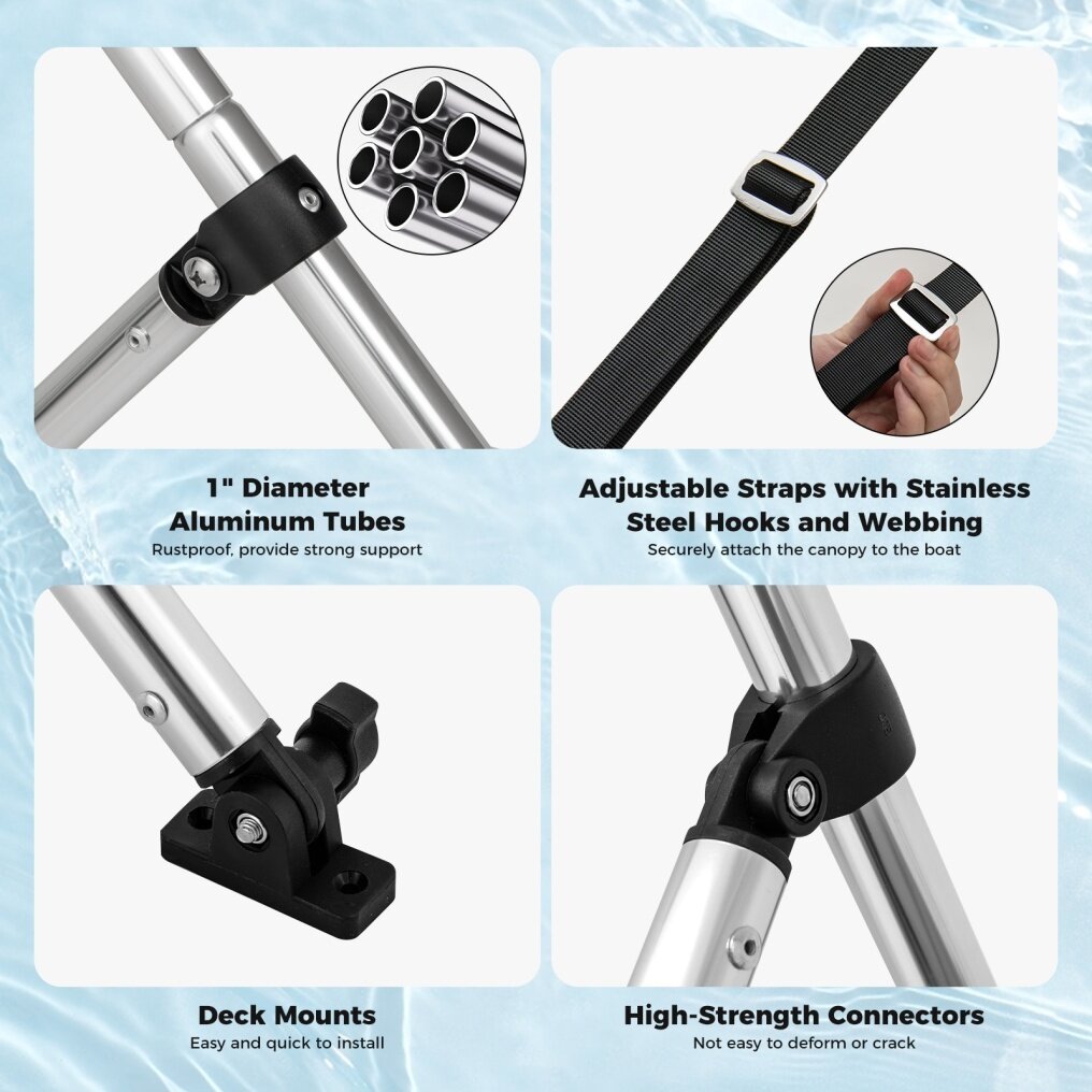 ● Stable and Reliable Structure: The supporting frame of the boat canopy is constructed from 1" diameter aluminum tubes, which are robust and rustproof, providing reliable support. The high-strength connectors ensure each component locks in securely, not easy to deform or crack.