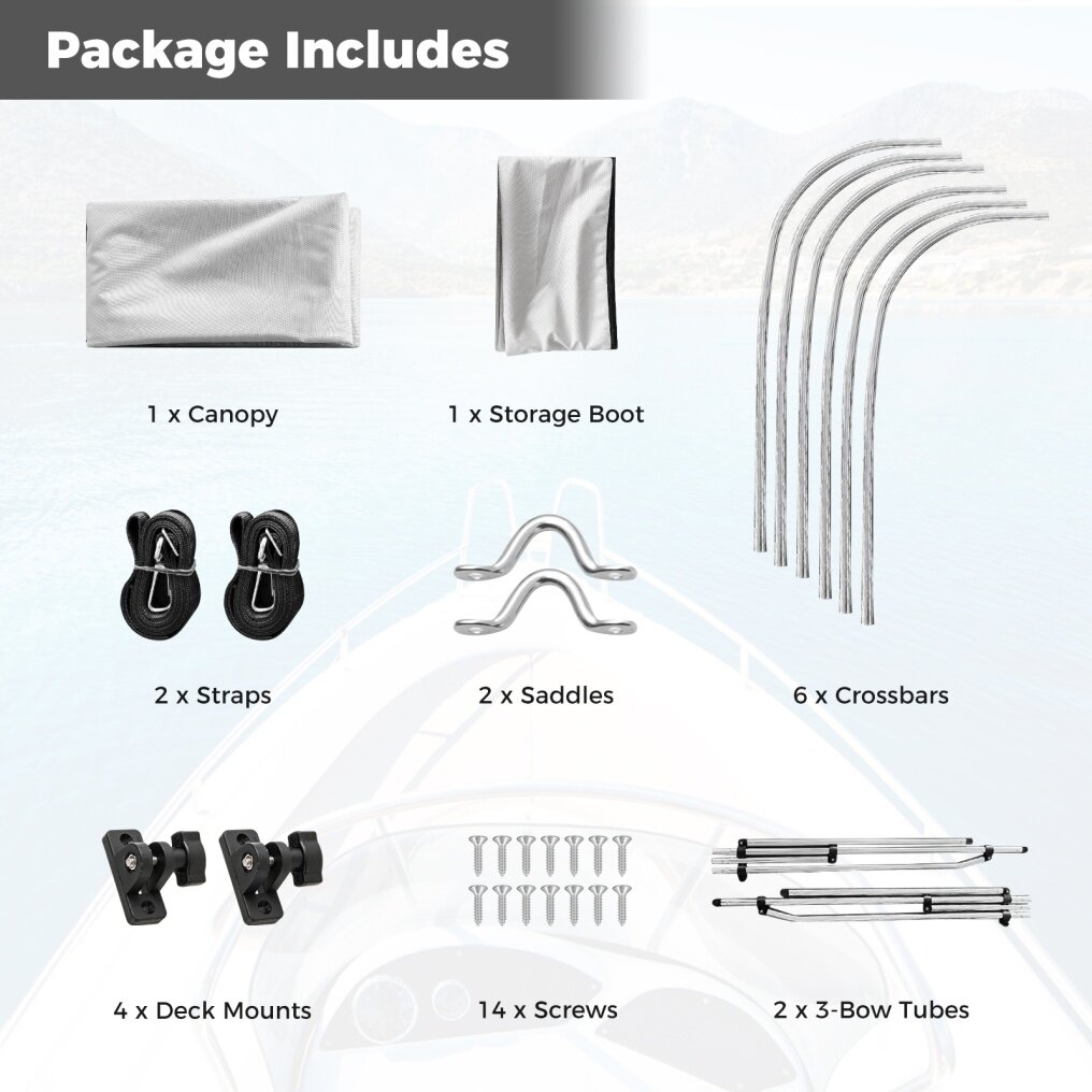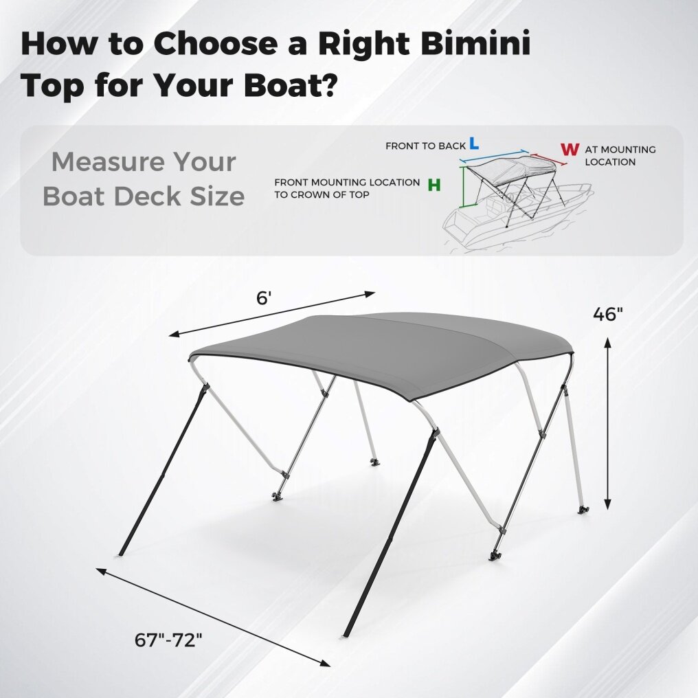 ● Versatile Size Options: The boat bimini top is available in 2 styles - 3 bows and 4 bows, offering flexibility to fit various boat sizes. The 3-bow boat canopy measures 6' x 67"-72" x 46" (L x W x H), while the 4-bow boat canopy measures 8' x 85"-90" x 54"(L x W x H). Ensure a perfect fit for your boat by measuring the length, width, and height of your boat deck to select the right size bimini top for optimal coverage and comfort.