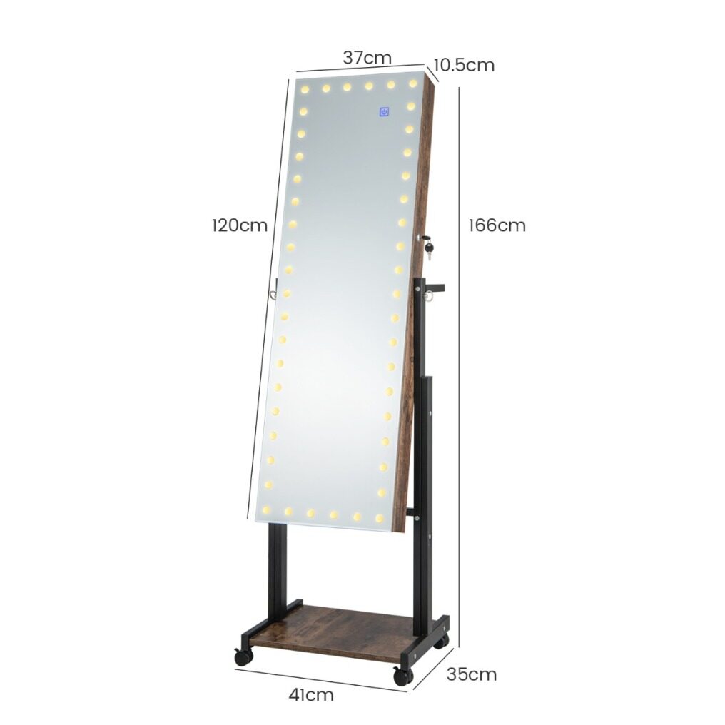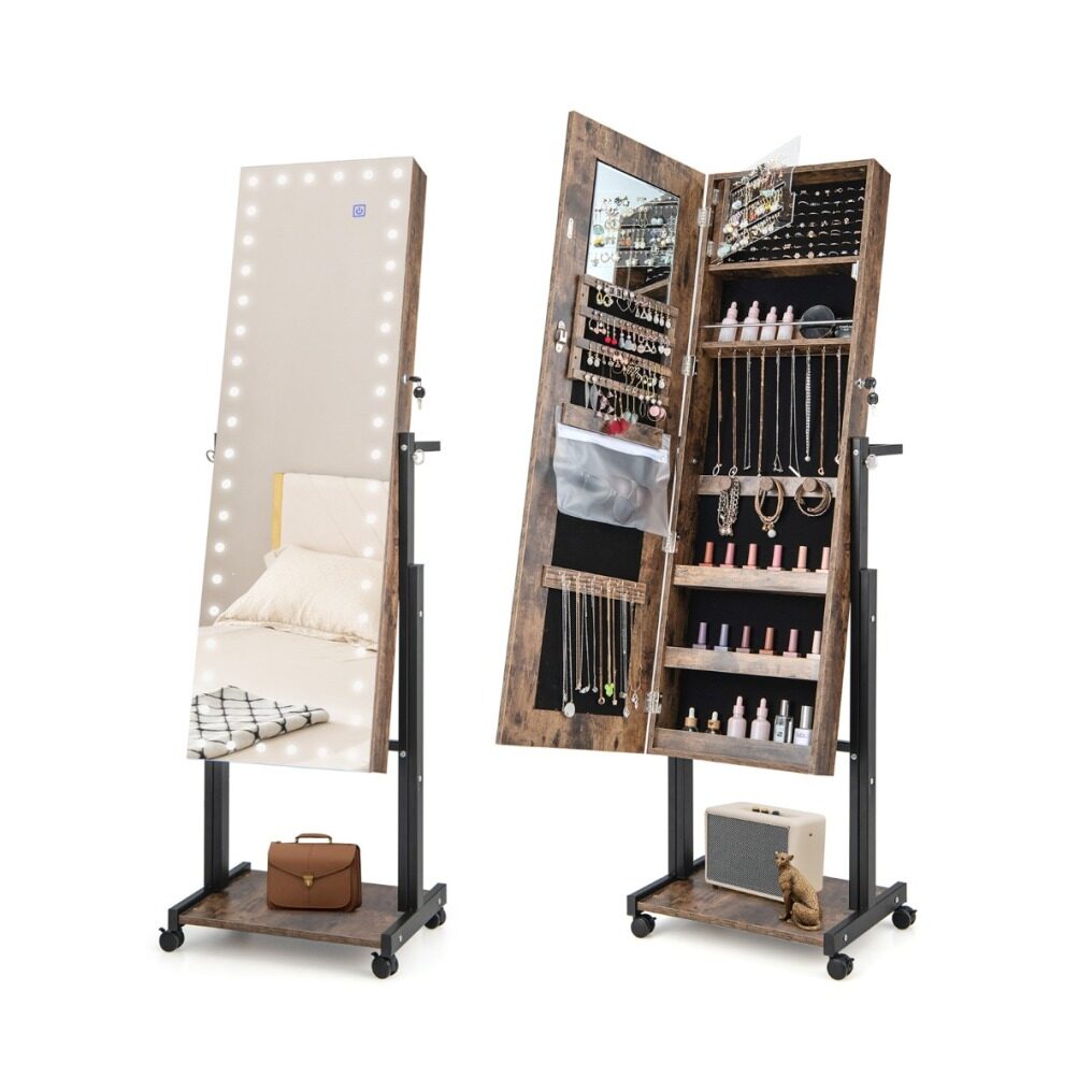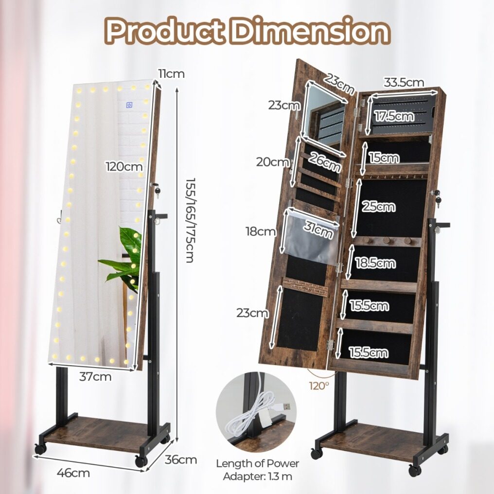 ● Adjustable Height and Angle: This jewelry organizer is available in 3 heights from 61" to 69" for users of different heights. Moreover, the full-length mirror can be adjusted in 2 tilt angles, offering an optimal angle to show a head-to-toe view of your outfits.